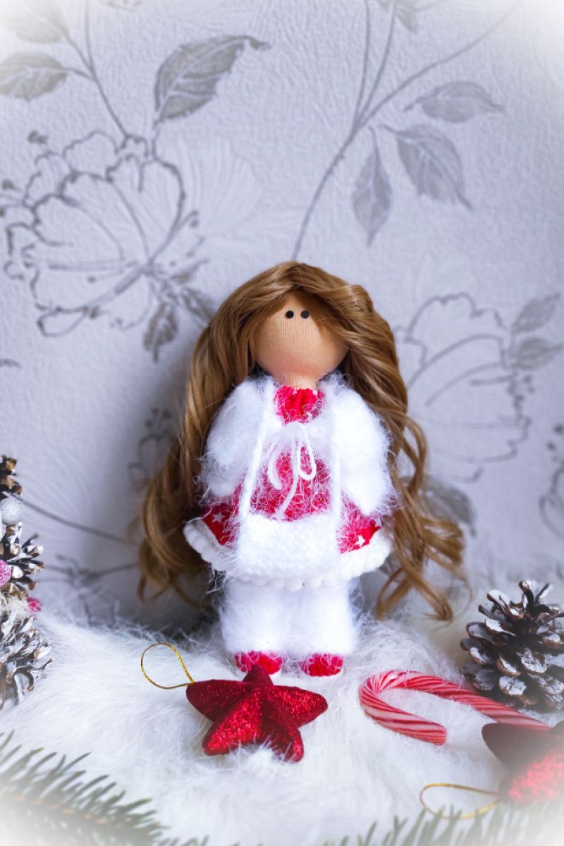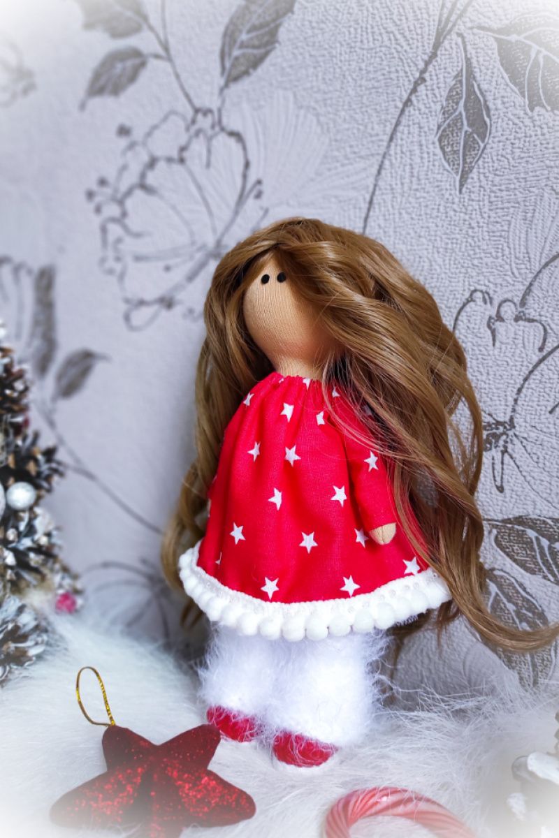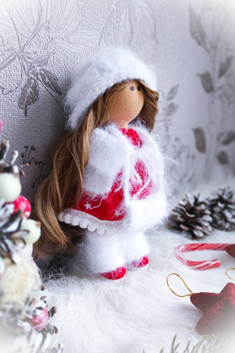 Крихітка одягнена в червону суконьку,має білу пухнасту шапулю, яку можна зняти та зробити лялечці зачіску, пухнастий кардиган та навіть справжня муфточка