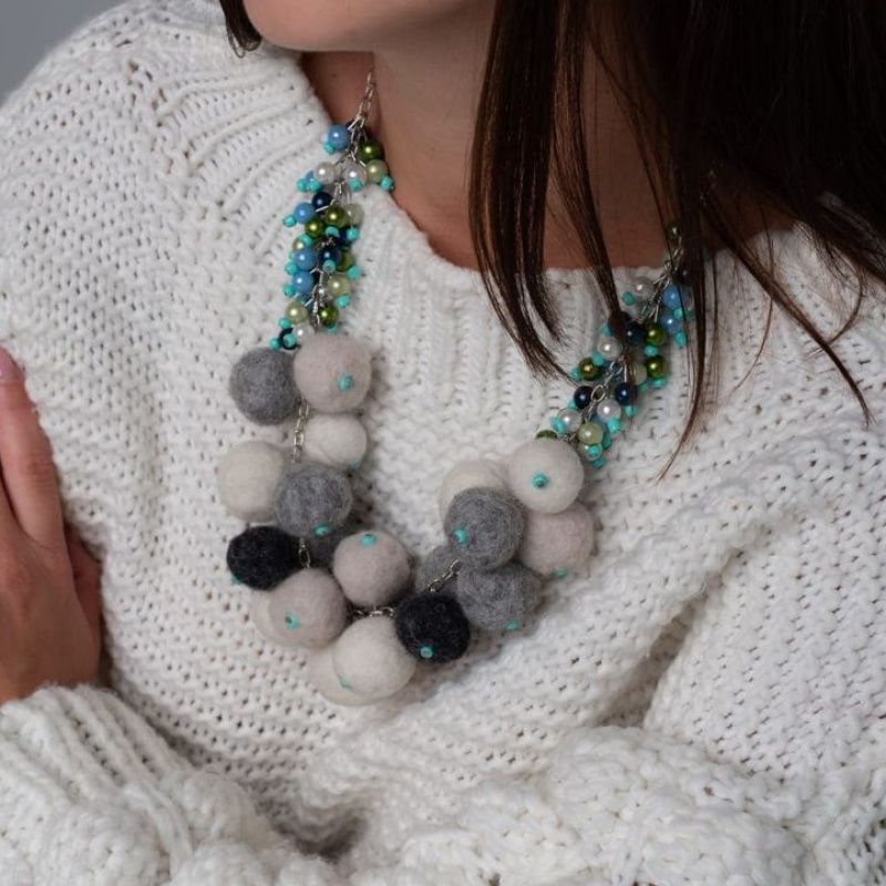 Стильні прикраси роблять кожну жінку та дівчину неповторною. Коли холодна або похмура погода завжди хочеться чогось теплого та яскравого. Прикраса ручної роботи з теплих і м′яких вовняних намистин яскравих і сонячних відтінків, доповнене різними намистинами.