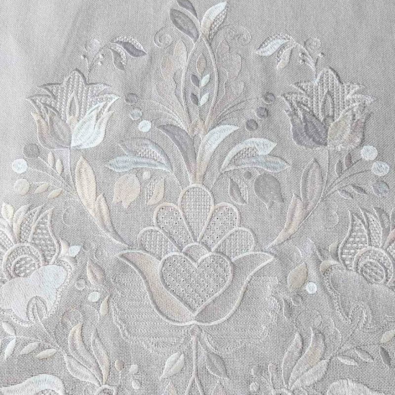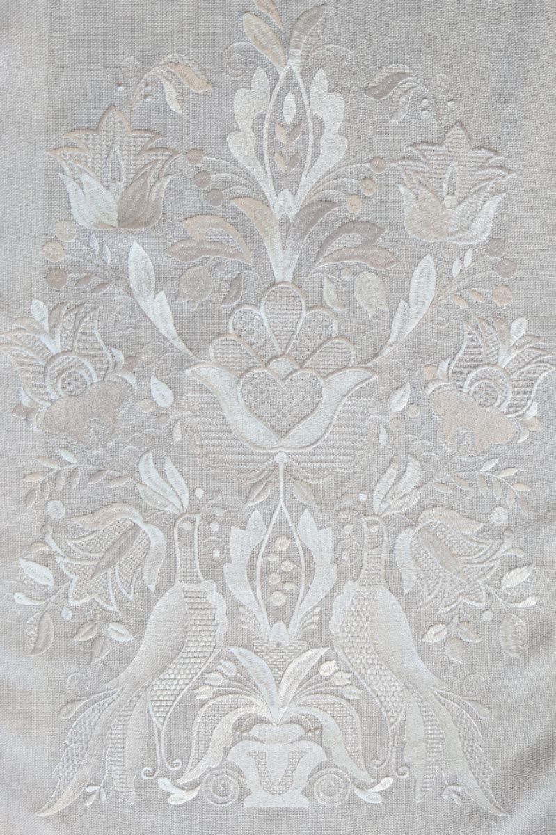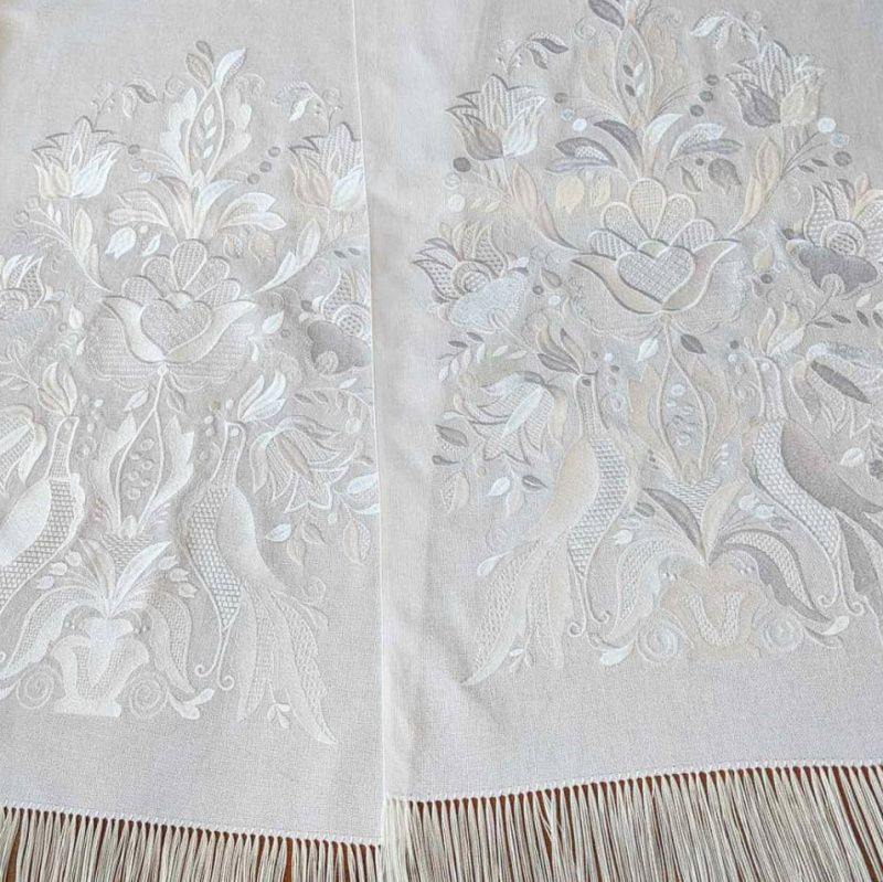 Весільний вишитий рушник білими по білому Оберіг - це поєднання машинної вишивки та ручної роботи. Машинна вишивка самого орнаменту виконана білими шовковими нитками. Сама вишивка є надзвичайно акуратною з ідеальною виворітною стороною. Як кажуть дослідники весільної обрядовості: виворітна сторона має бути без вузлів, перетягів і запутувань. Адже лице виробу для людей, а виворіт для Бога. Закінченням рушника є тороки ручної роботи, виконані білими шовковими нитками.
