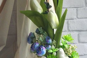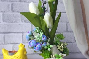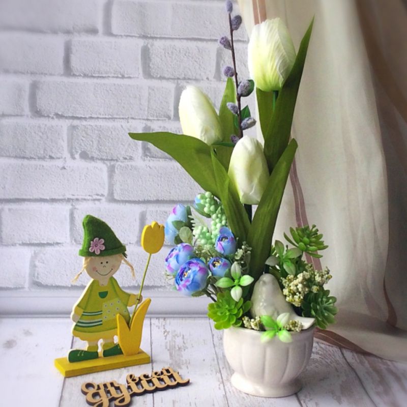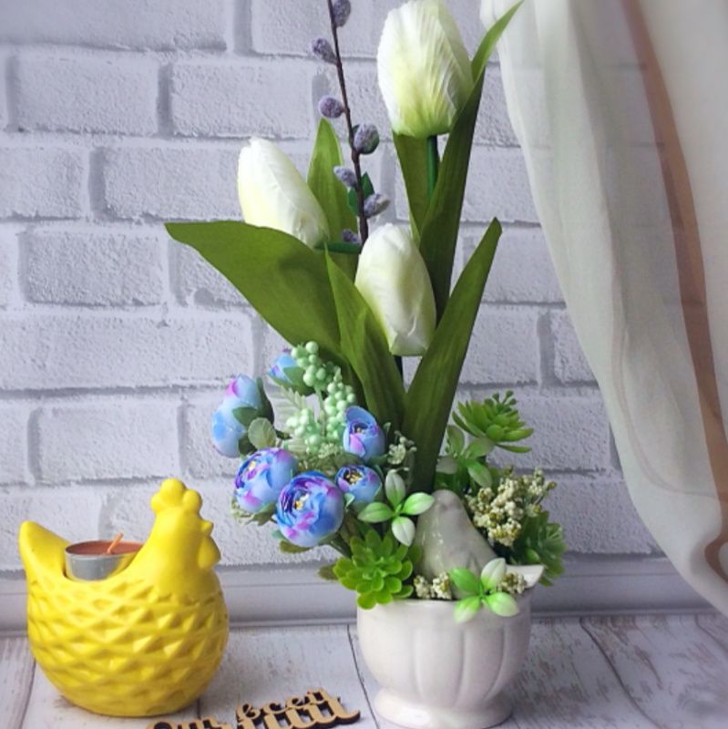 Інтер‘єрна композиція із штучних квітів з керамічною пташкою стане вам прикрасою під час святкування Великодня, гарним подарунком рідним або друзям .