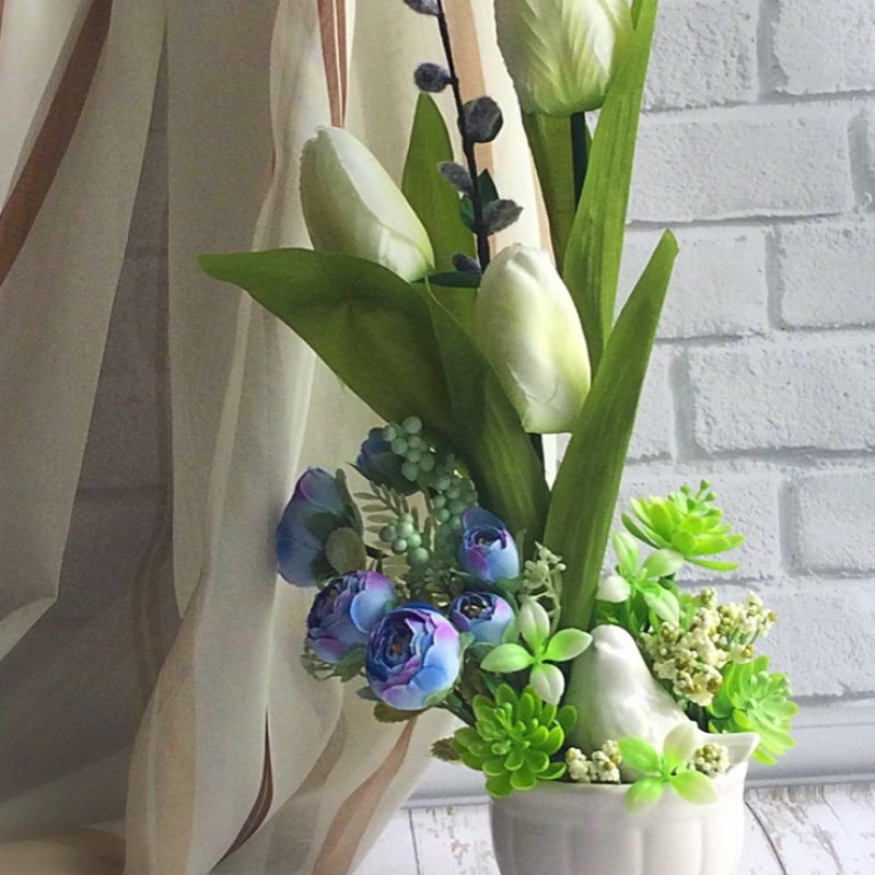 Виготовлено з штучних квітів високої якості, пташка і кашпо керамічні.