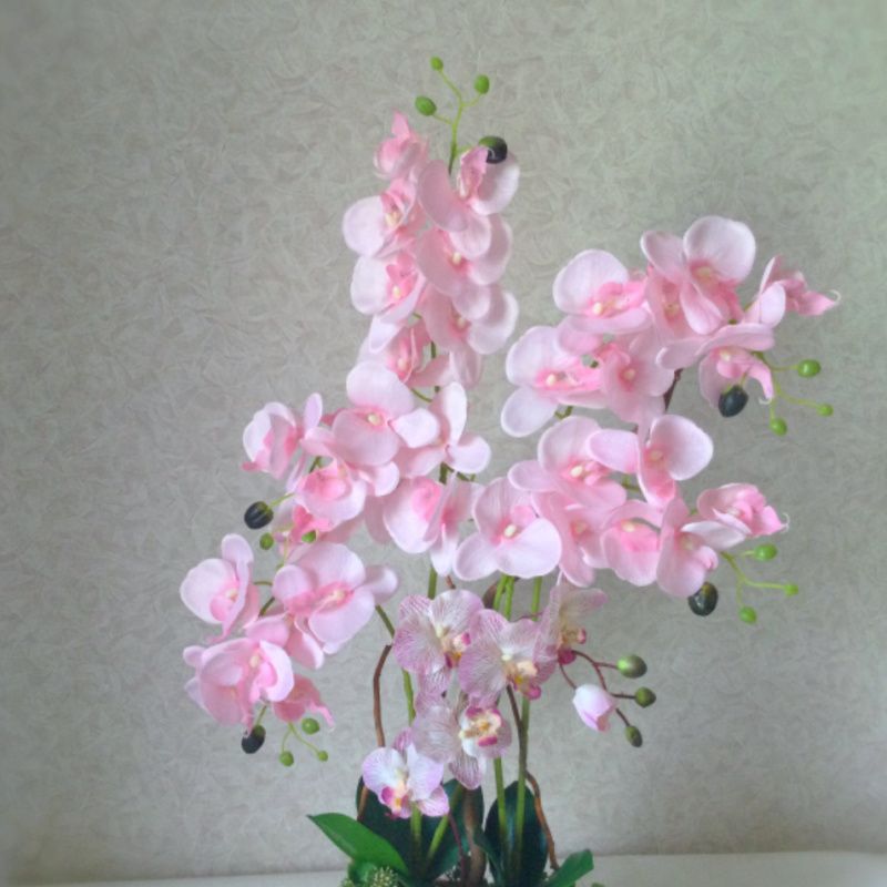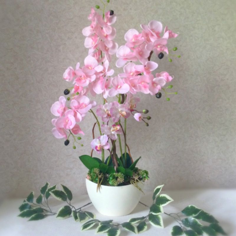 Орхідеї виготовлені з високоякісної тканини зі спеціальною пропиткою. Виглядають дуже реалістично. Гілки орхідей гнучкі, їх можна повертати за бажанням.