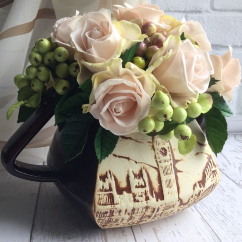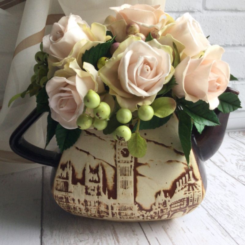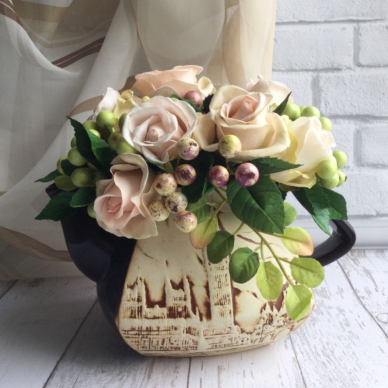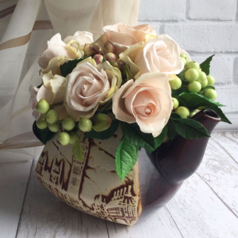 Композиція з трояндами у керамічному чайнику прикрасить вашу оселю, офіс, стане приємним подарунком до будь-якого свята.