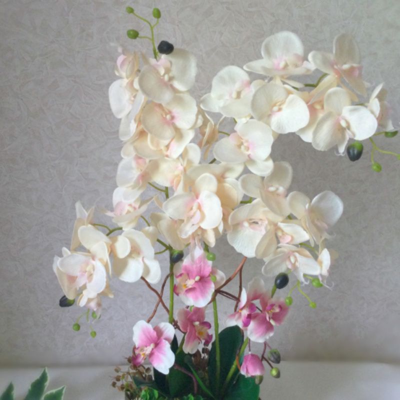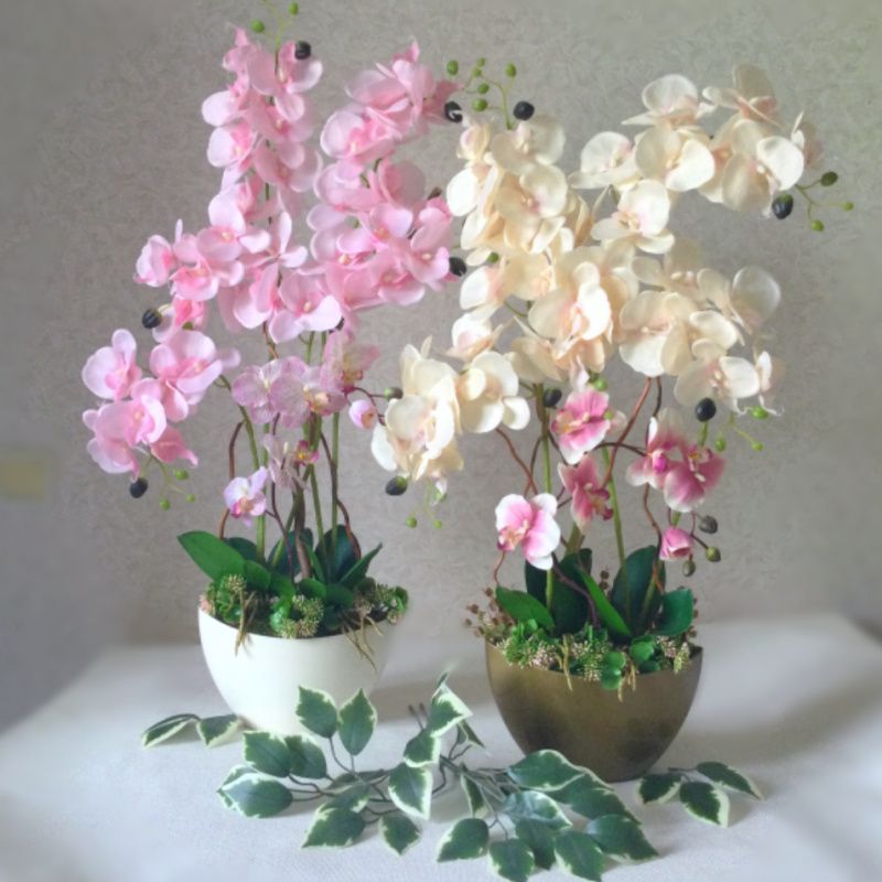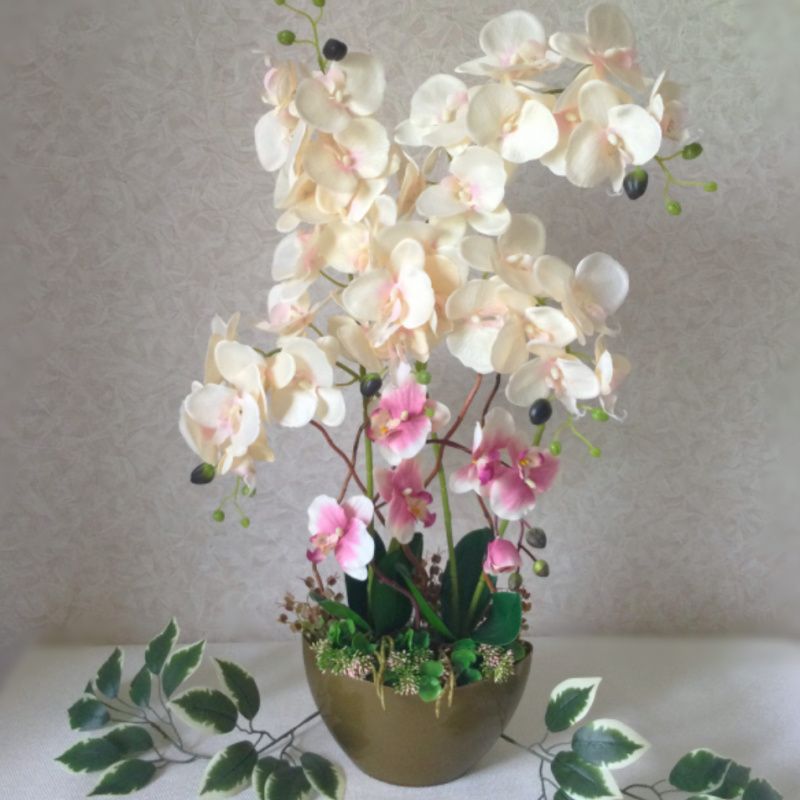 Орхідеї виготовлені з високоякісної тканини зі спеціальною пропиткою. Виглядають дуже реалістично. Гілки орхідей гнучкі, їх можна повертати за бажанням.