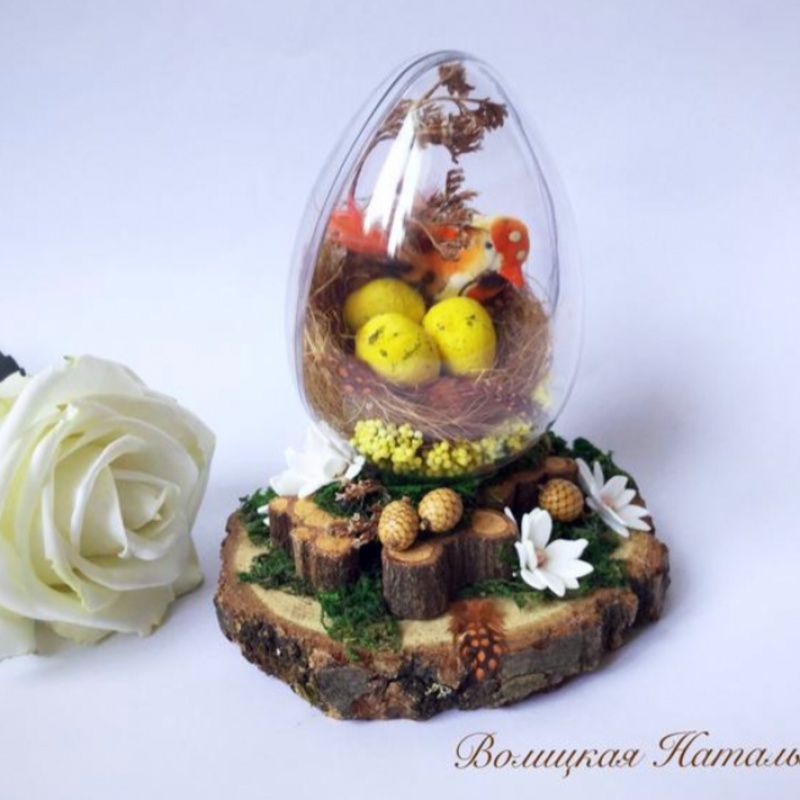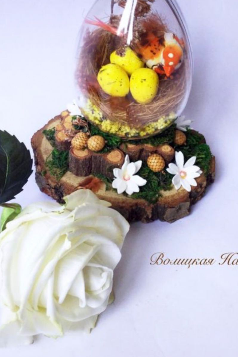 Мініатюра в Великодньої тематики. Ручна робота. Використано декоративні елементи, куля пластмасовий, квіти ручної роботи з фоамірана, натуральні зрізи дерева, мох, пір'я.