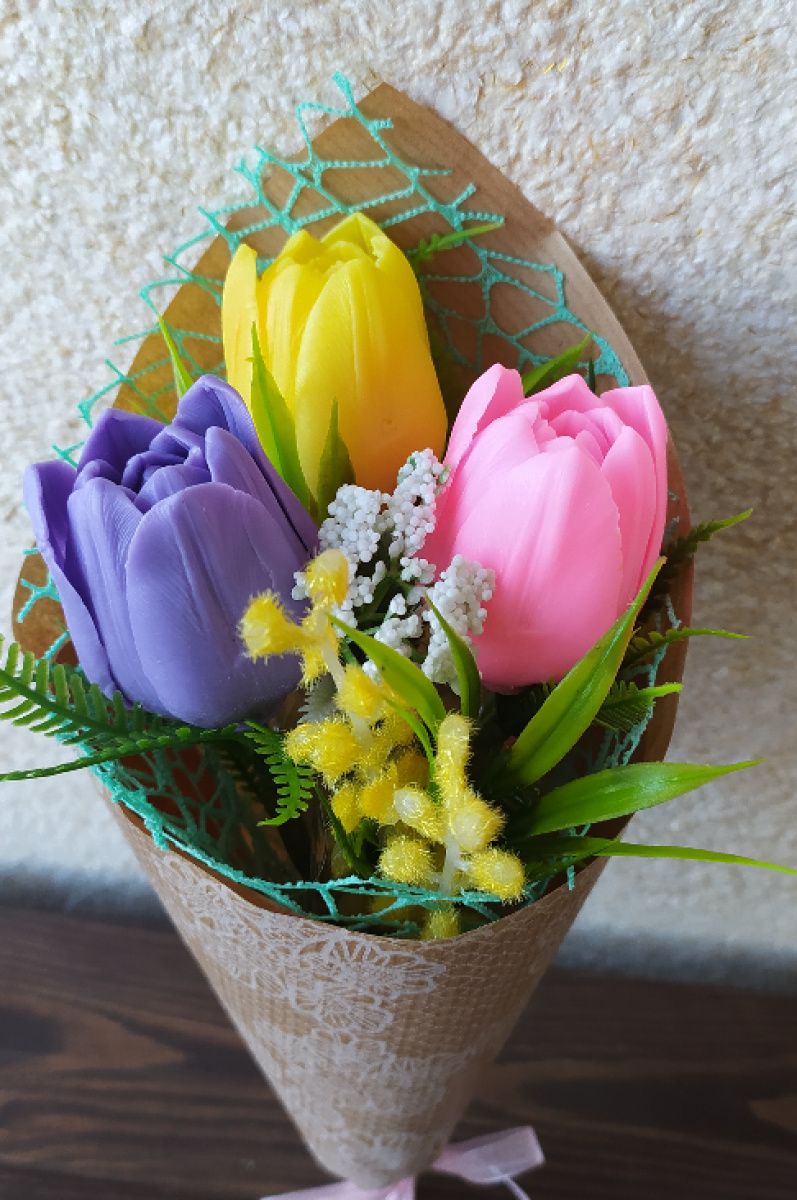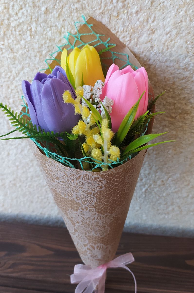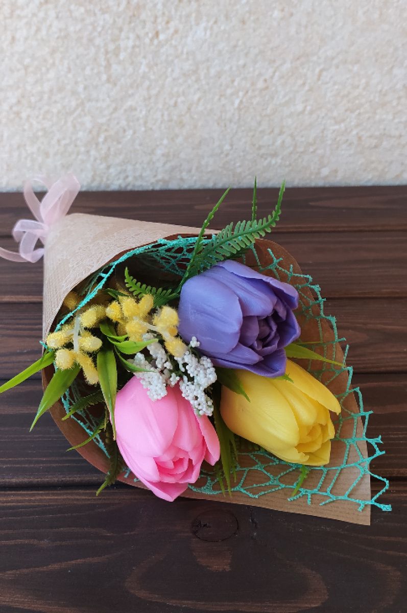 Букет із трьох мильних тюльпанів із приємним ароматом весняних квітів.