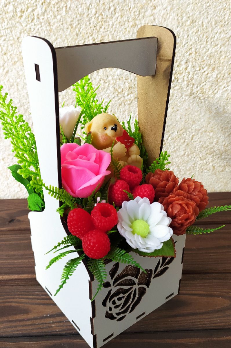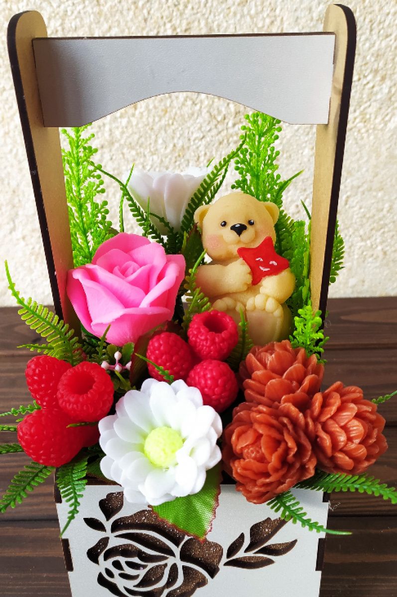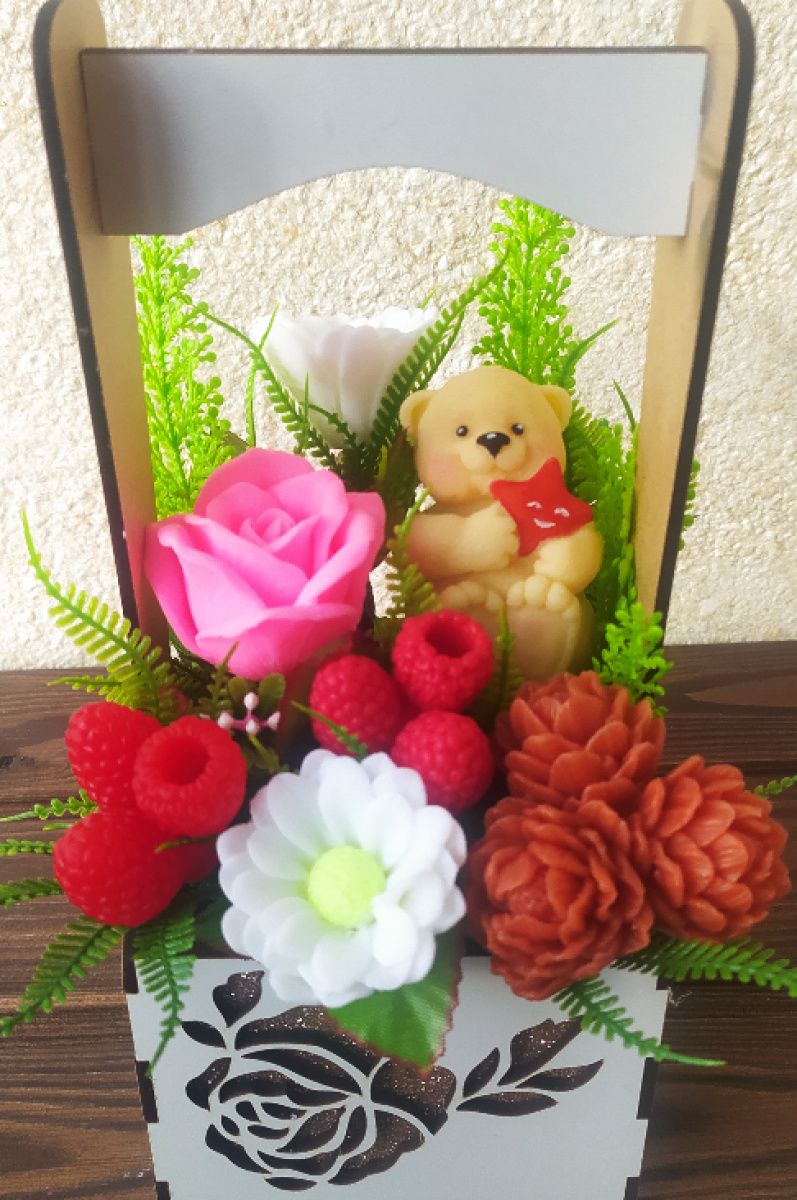 Композиція з мила, квіти, ягоди , шишки, ведмедик виконані з якісної ізраїльської основи, решта зелені декор.