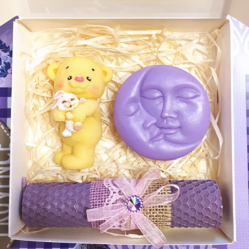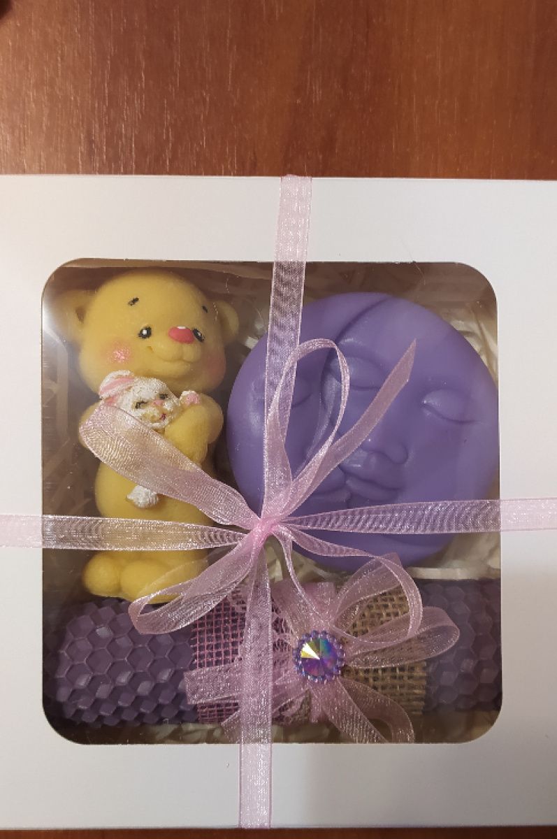 У наборі мило ручної роботи (ведмедик і місяць) та свічка з натуральної вощини.