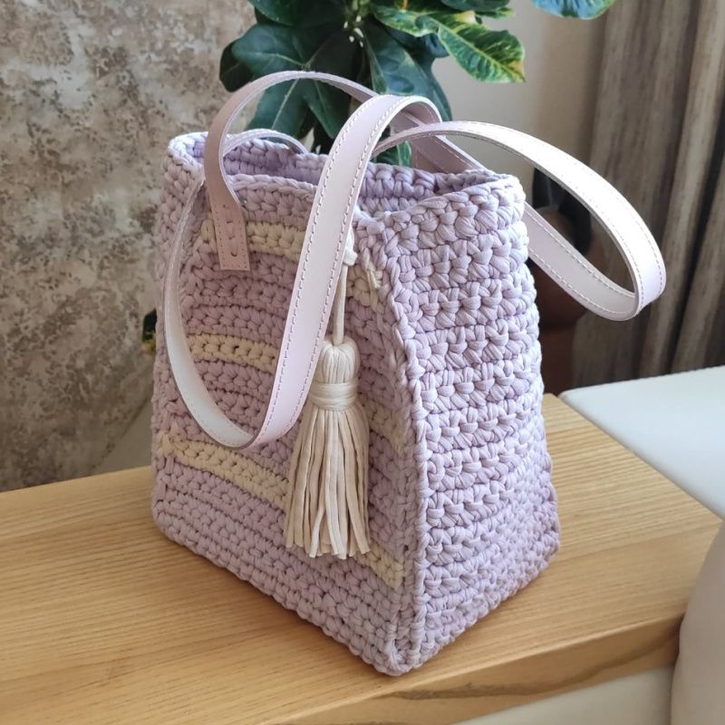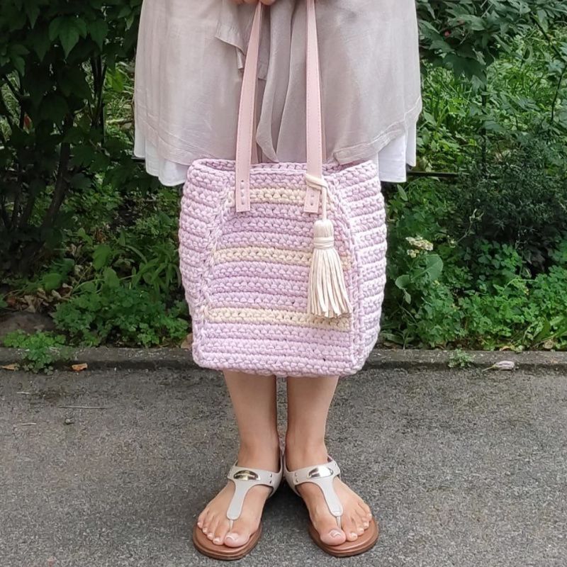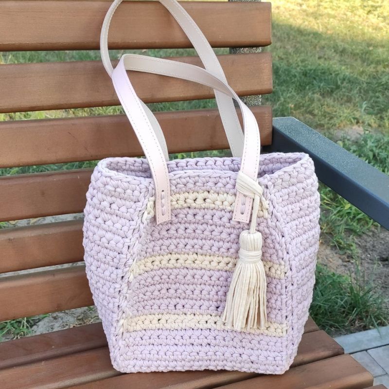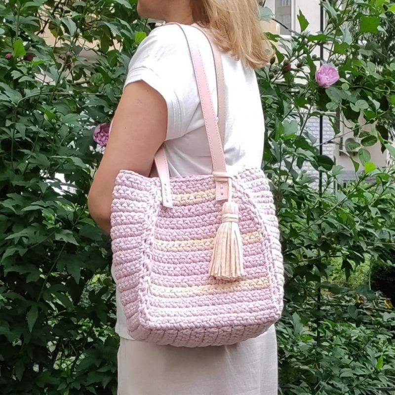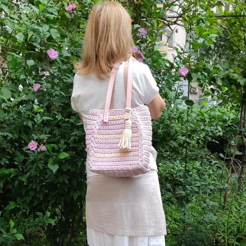 В наявності А у мене новинка з трикотажної пряжі Сумка-шоппер в кольорі рожева пудра з шкіряними ручками і пензликом. Дуже містка і зручна. Можна носити на плечі і в руці. Розміри: Висота 27 см Ширина 23 см Ширина бічних стінок 15 см Денце 23х15 см Ручки 70 см Довжина з ручками 54 см Ціна 1300 грн.
