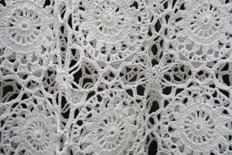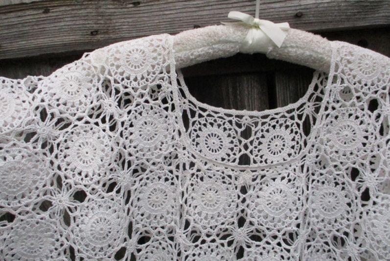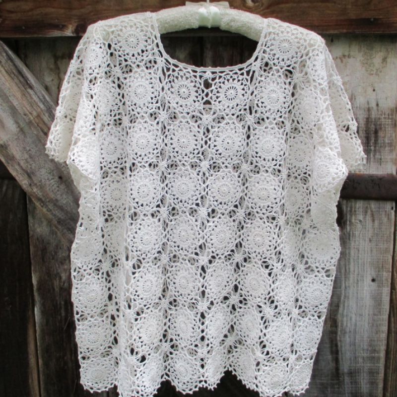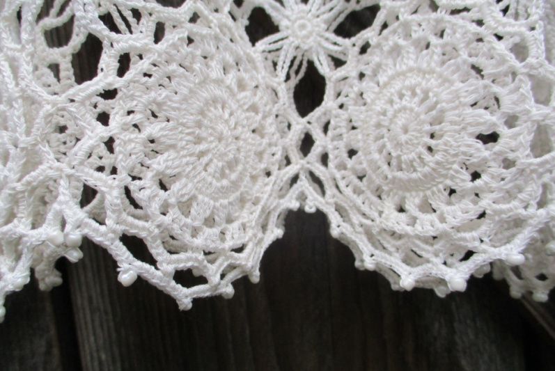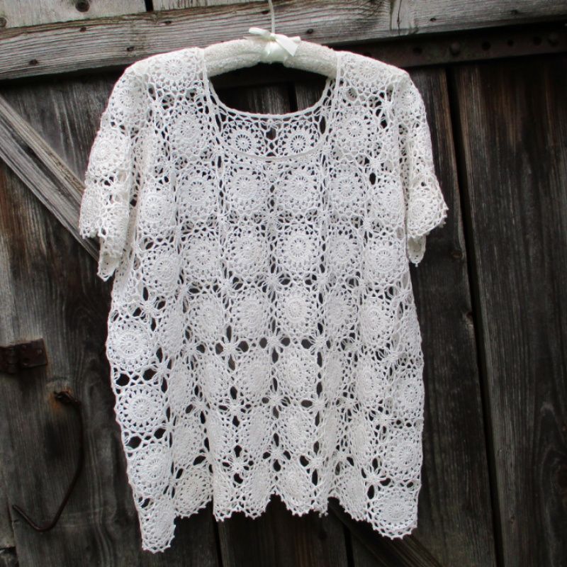 Блуза пов'язана гачком з окремих мотивів. 100% бавовна молочного кольору. По низу виробу і рукавів вплутався бісер для поліпшення посадки вироби. ПОГ 59см, довжина 63 см, глибина вирізу 15 см, ширина рукава 18 см. На мій 52-й розмір села прекрасно. В єдиному екземплярі