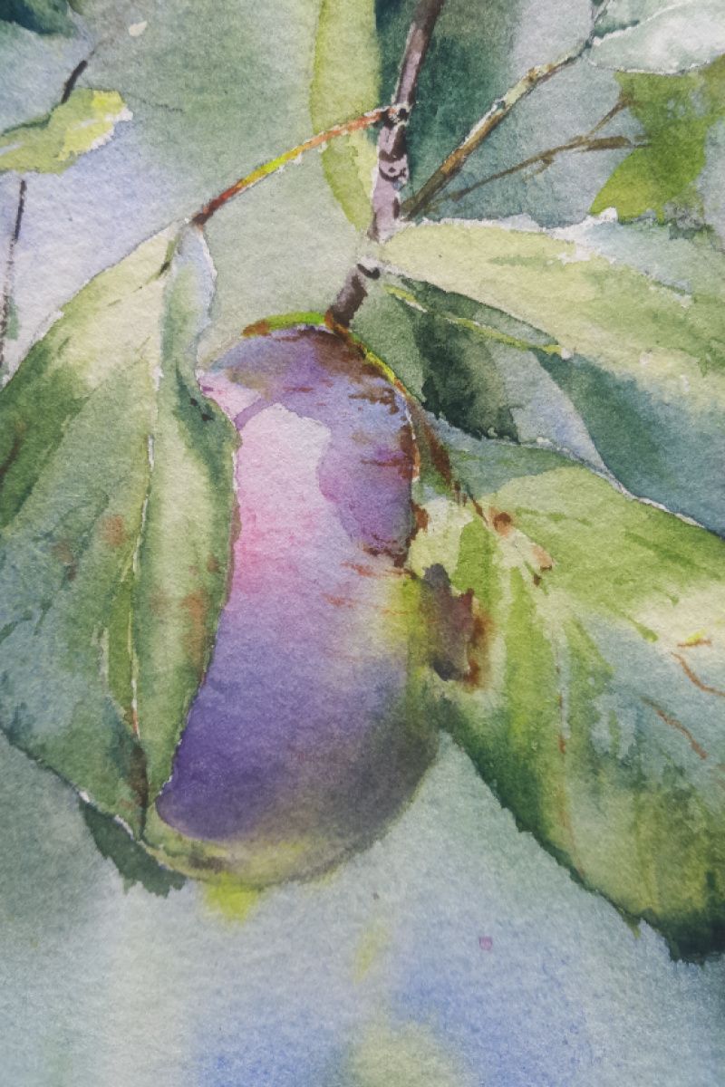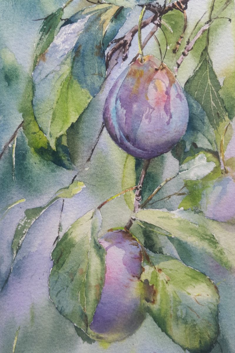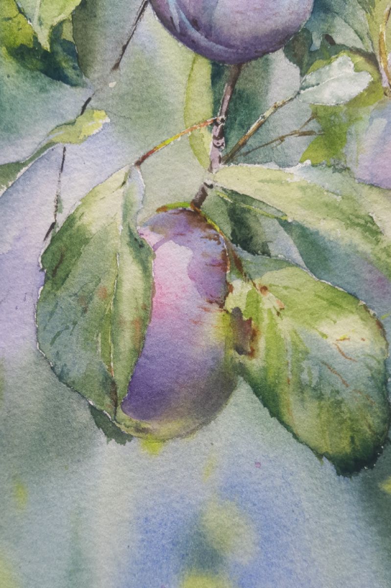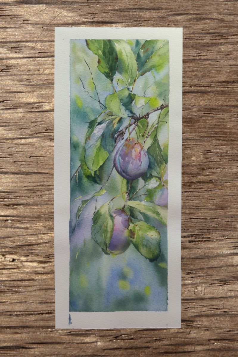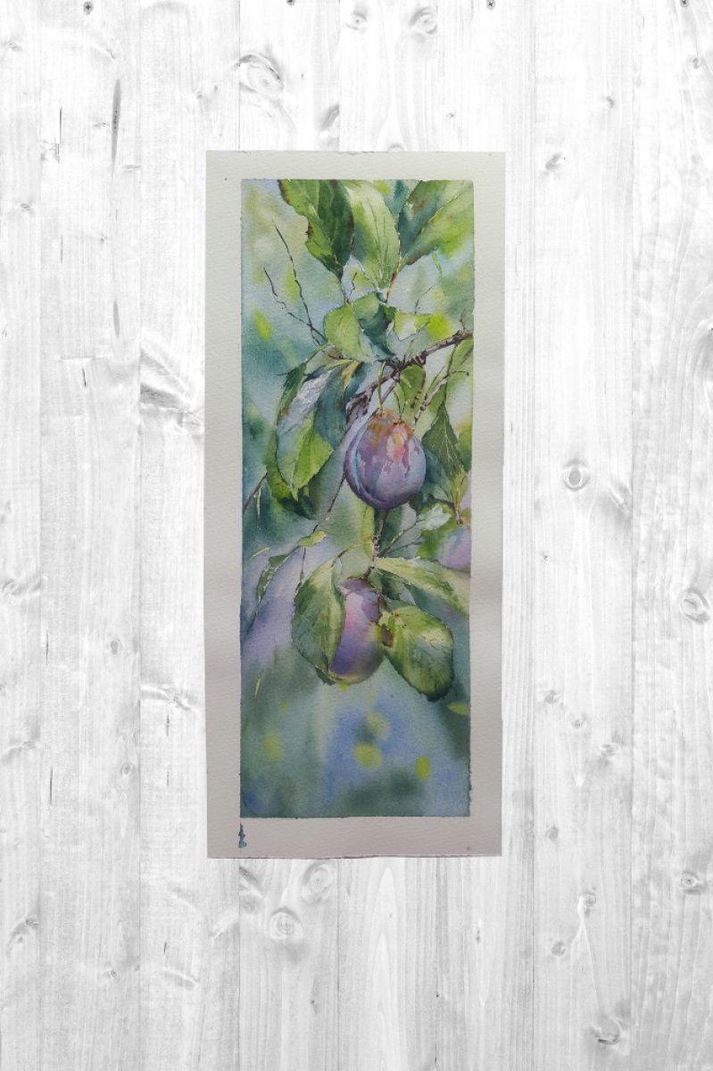 Картина - малятко "Сливи". Виконана на бавовняній папері щільністю 300гр аквареллю. Розмір 11 * 29см.