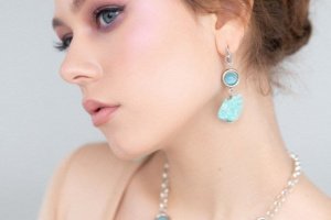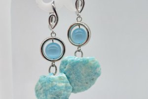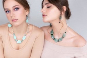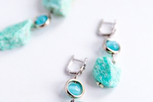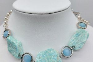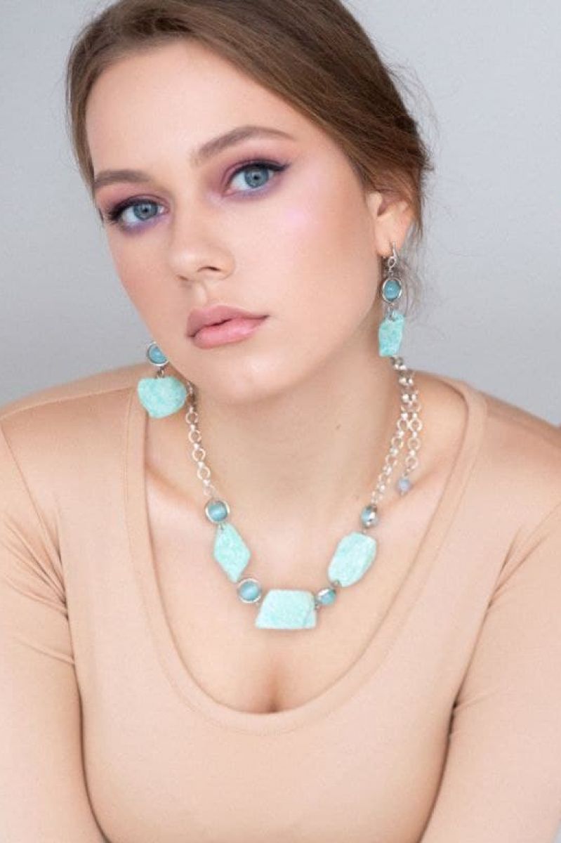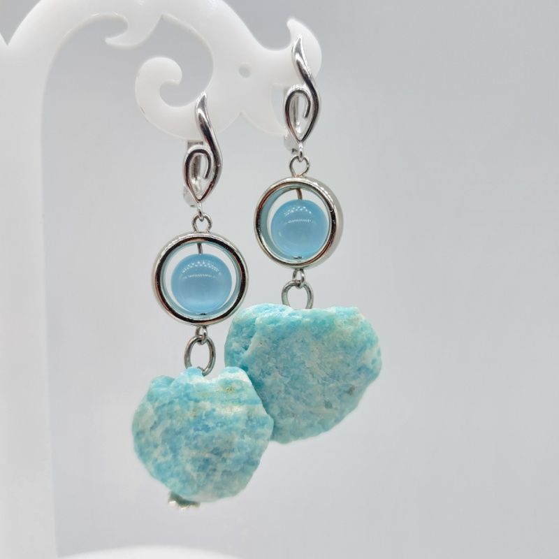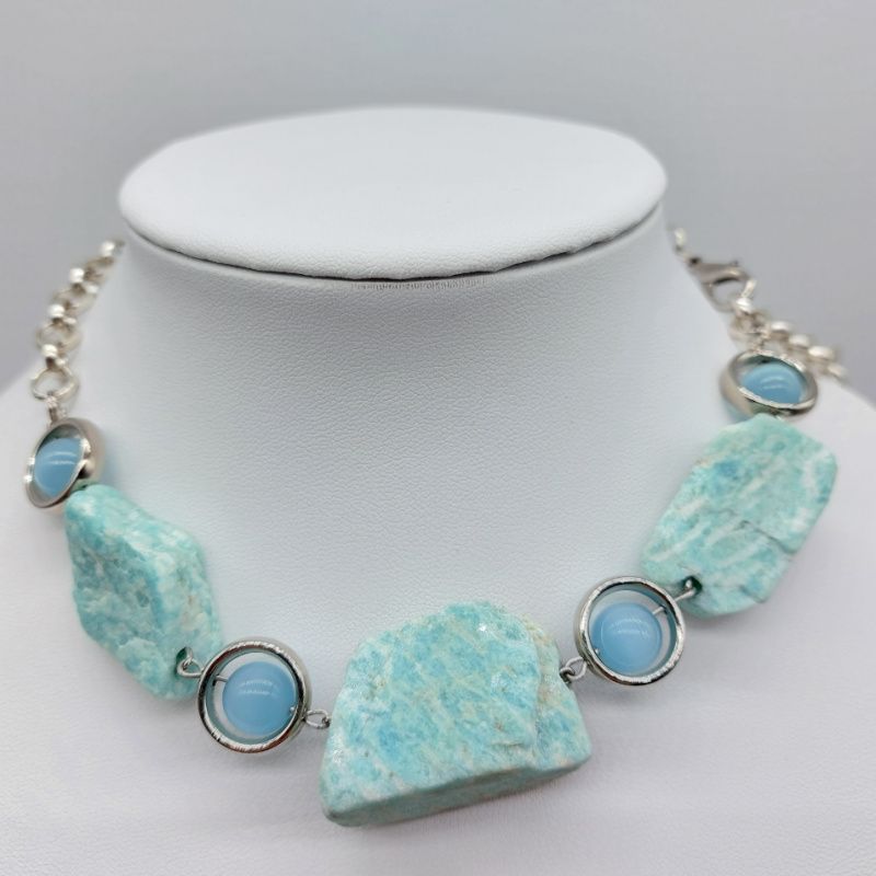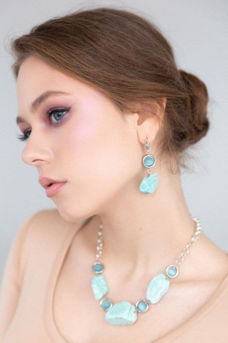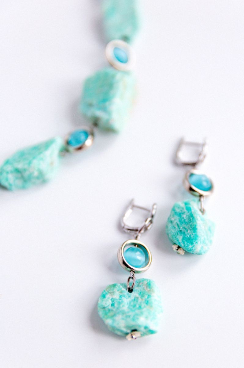 Комплект прикрас з необробленого натурального каменю Амазоніт та кілька намистин Котячого ока. Використана гіппоалергенна фурнітура