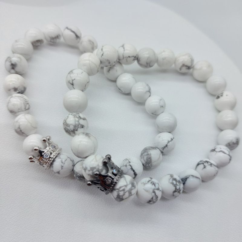 Парні браслети з натурального каменю Кахолонг 8мм з використанням гіппоалергенної фурнітури інкрустованої фіанітами