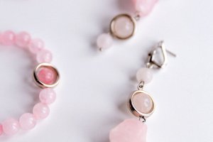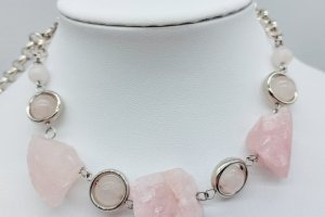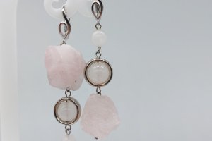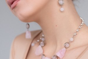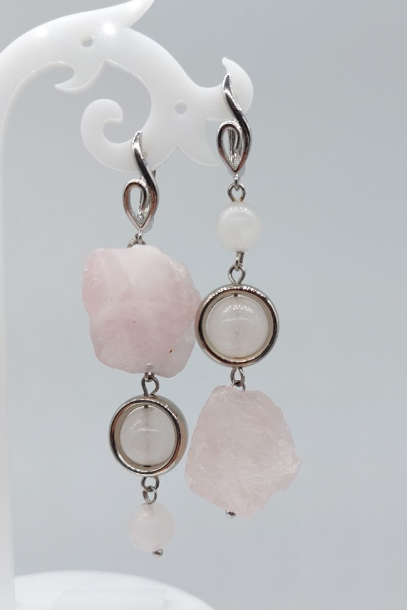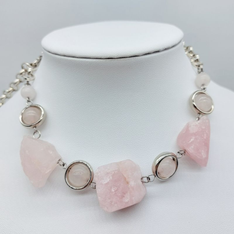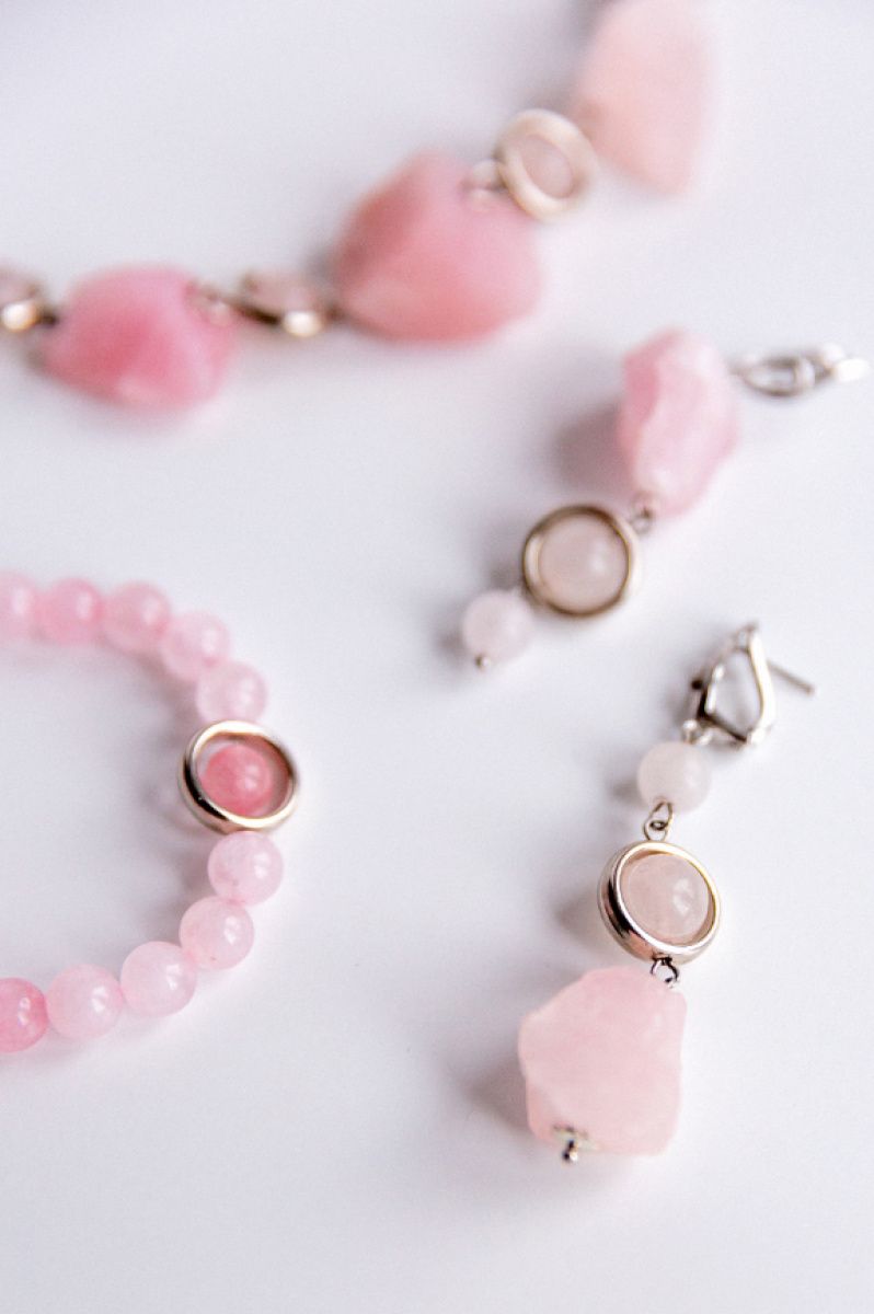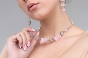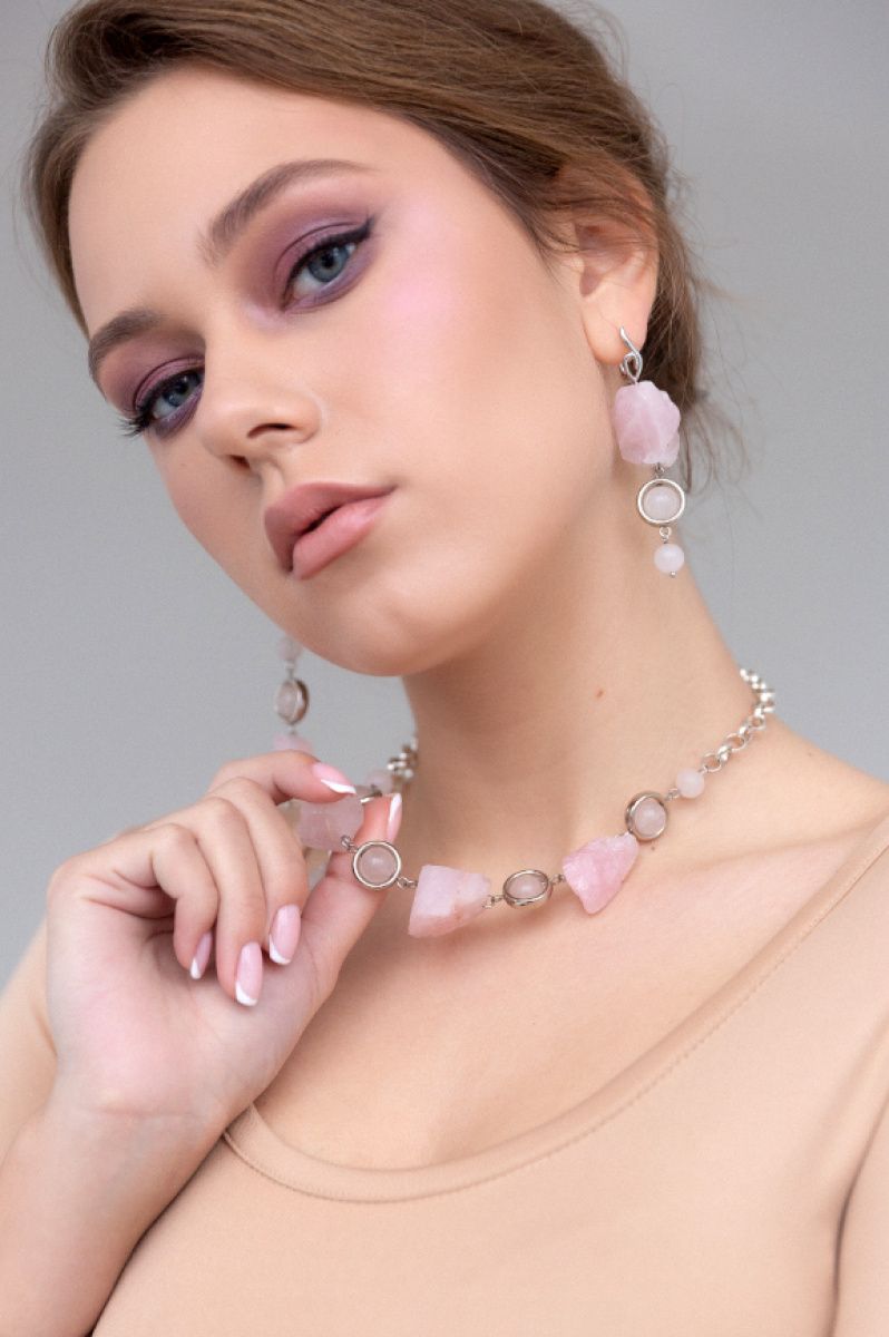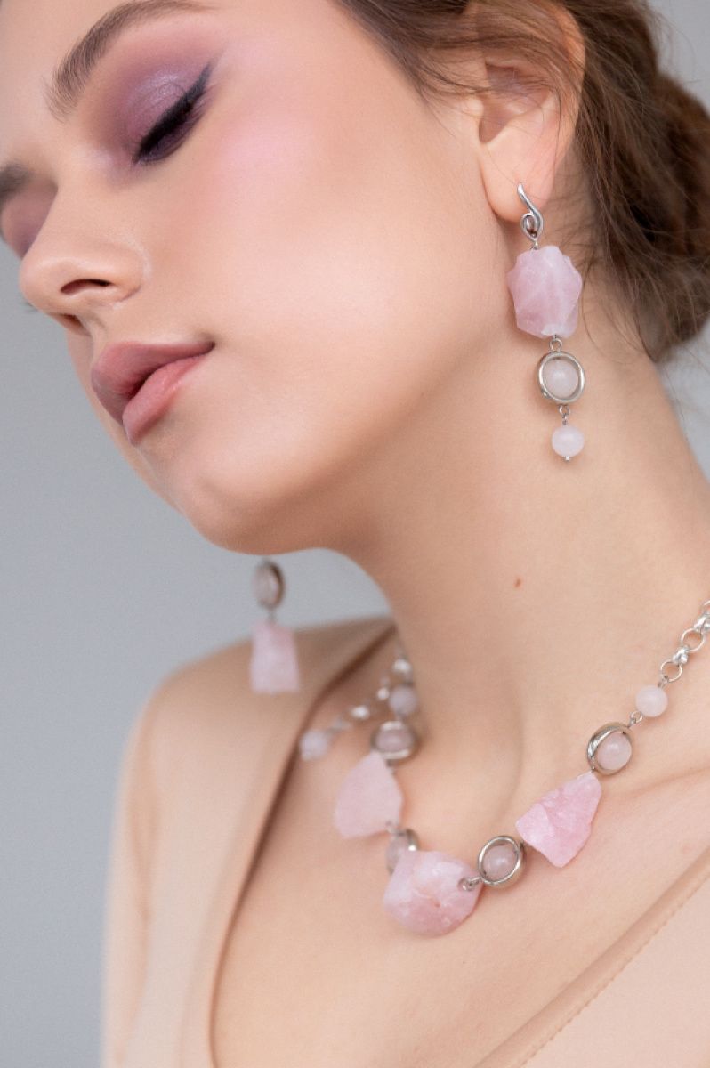 Комплект прикрас з натурального необробленого розового кварцу з гіппоалергенною фурнітурою. В комплекті сережки, кольє та браслет