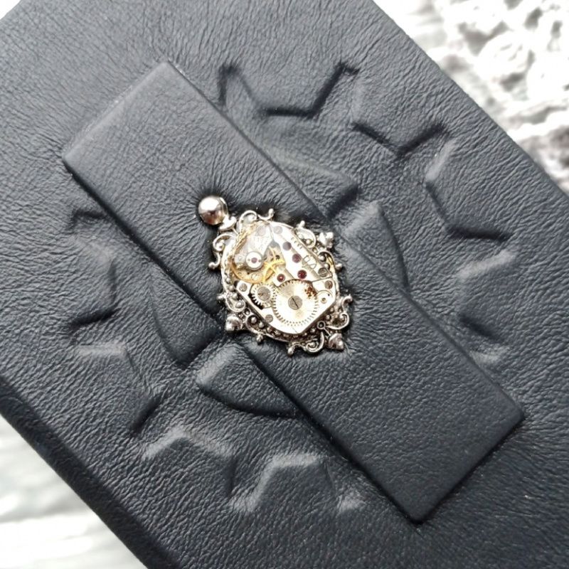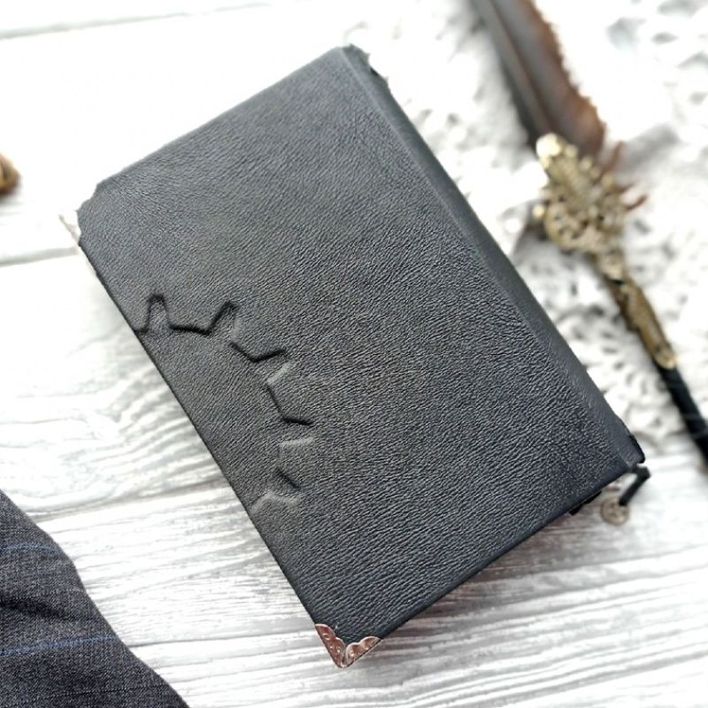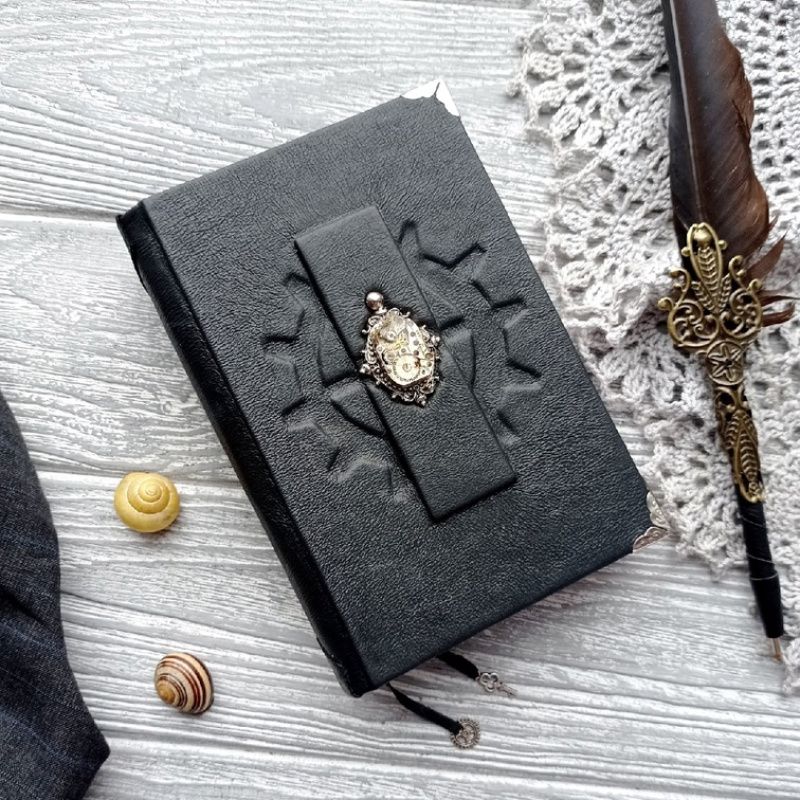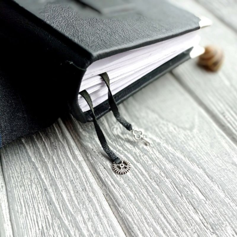 "Механіка" чорний Блокнот зручного формату А6 (15\10.5см). Приємна рельєфна обкладинка. Прикрашена накладкою ручної роботи (Bubble Bird Art ❂ Steampunk). Всередині брошки - справжні годинникові шестірні, бережно укладені та покриті епоксидною смолою. Папір змінний, кріпиться на гумки. Можна замінити самостійно. Не потрібно виривати сторінки. Кожен аркуш можна вийняти, поміняти місцями або вставити ще аркуш у потрібному місці. Є дві шкіряні закладки із підвісками. Кути обкладинки дбайливо захищені металевими куточками. Матеріали: натуральна шкіра, палітурний картон, папір, клей, гумка, металева фурнітура
