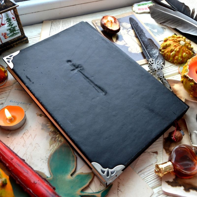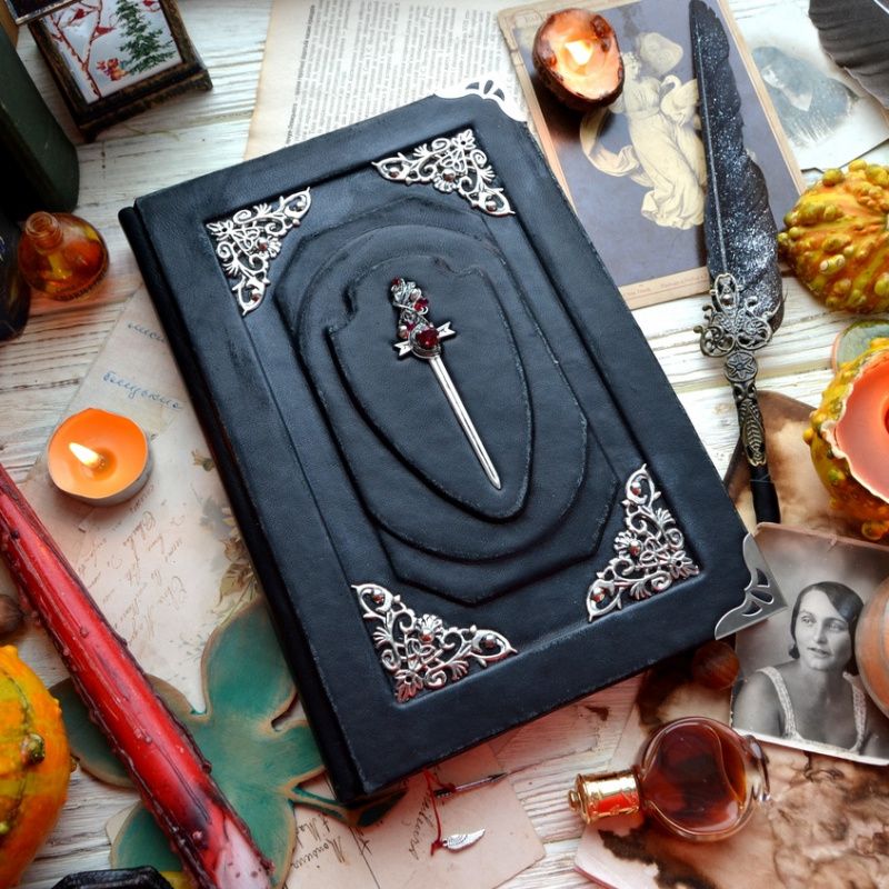 "Меч" Вишуканий блокнот з приємною м'якою кожі.Обложка рельєфна. У центрі обкладинки меч з кристалом і плетінням від TWIGGI LIGHT. Далі красива масивна металева фурнітура і захисні куточки. Ззаду рельєф у формі меча. Шкіра злегка состарена, це надає блокноту нотку старовини. Ніби тільки вчора він був на столі лицаря, а сьогодні тут, в 2021. Сторінки молочного кольору в клітину, чорні форзаци і кишеньку для потрібних дрібниць: візиток, стікерів, карточек.Две закладки з підвісками. До блокноту можна підібрати або зробити ручку