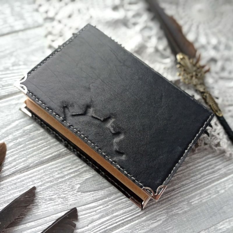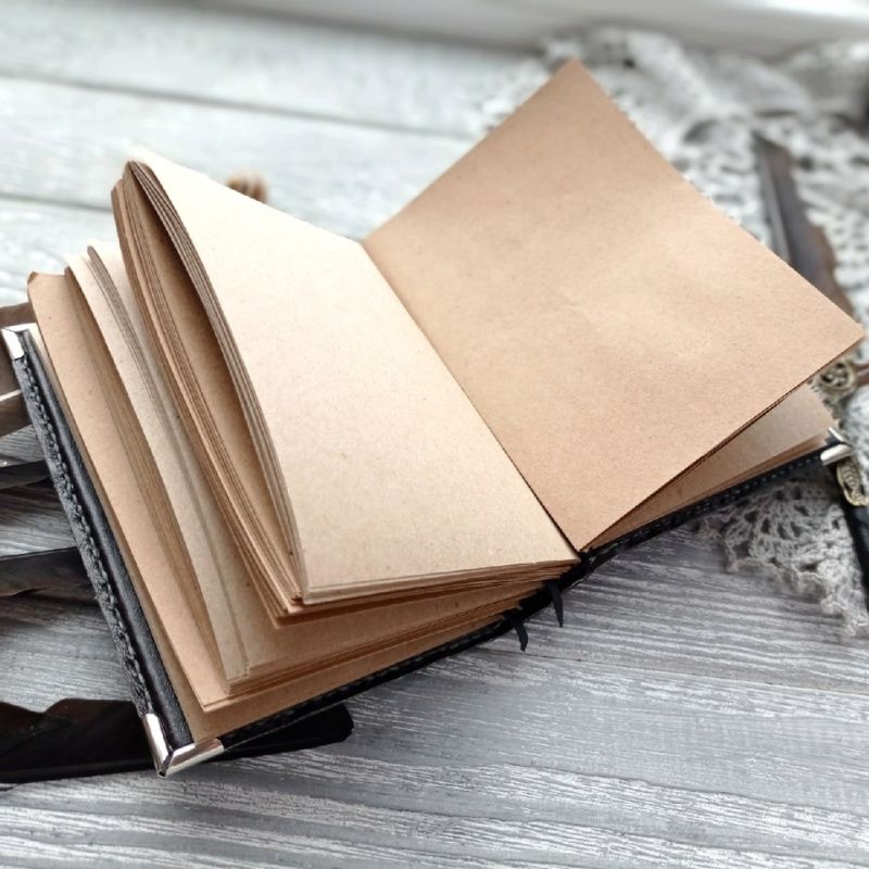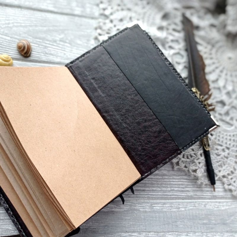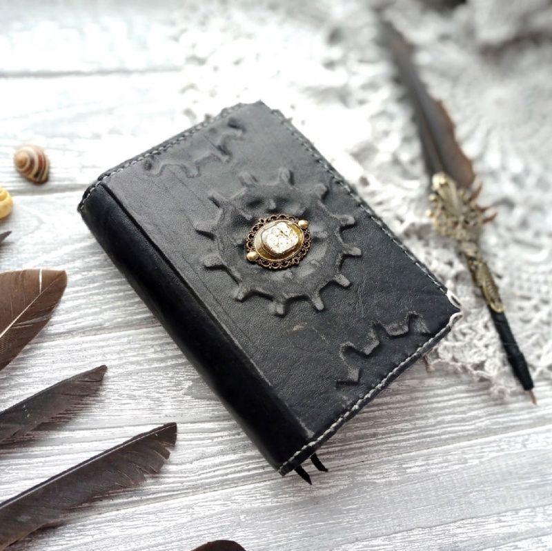 "Механіка" чорний Блокнот зручного формату А6 (16\11.5см). Приємна рельєфна обкладинка. Шкіра зістарена. Прикрашена накладкою ручної роботи (Bubble Bird Art ❂ Steampunk). Всередині брошки - справжній годинниковий механізм, бережно покладений та покритий епоксидною смолою. Крафтпапір, змінний, кріпиться на гумки. Можна замінити самостійно. Не потрібно виривати сторінки. Кожен аркуш можна вийняти, поміняти місцями або вставити ще аркуш у потрібному місці. Є дві шкіряні закладки. І кишенька для візиток, календариків чи стікерів. Кути обкладинки дбайливо захищені металевими куточками. Матеріали: натуральна шкіра, палітурний картон, папір, клей, гумка, металева фурнітура