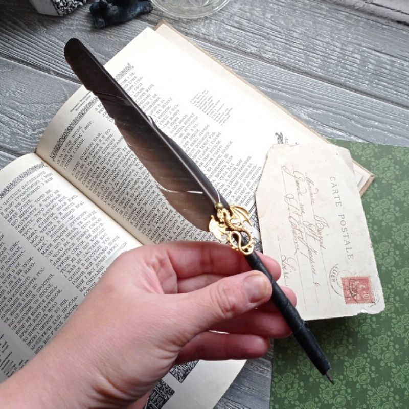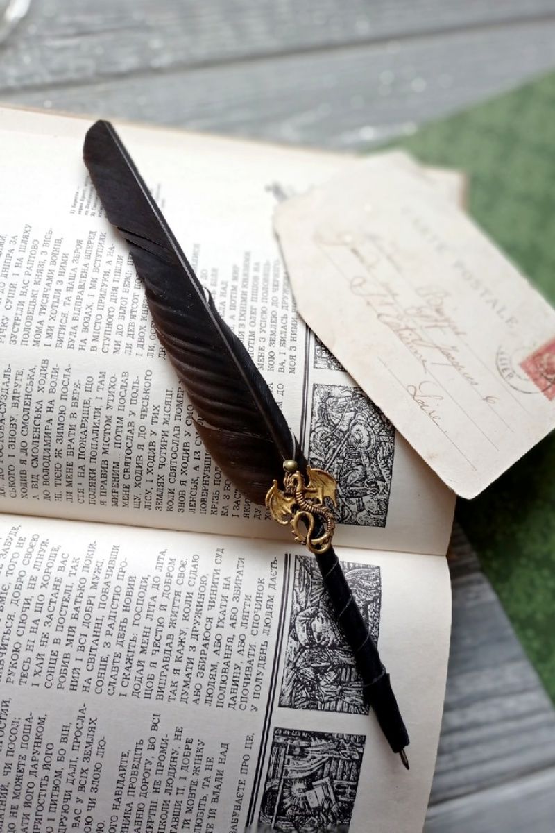 "Золотий дракон" 27, 5см Кулькова ручка зі змінним зарядом. Не залишить байдужим і шанувальників книг та мрійників. Вона-частинка чарівного у повсякденному житті. Чорне перо ворони, натуральна шкіра. Заворожує. Матеріали: перо ворони, натуральна шкіра, кульковий заряд, металева фурнітура.