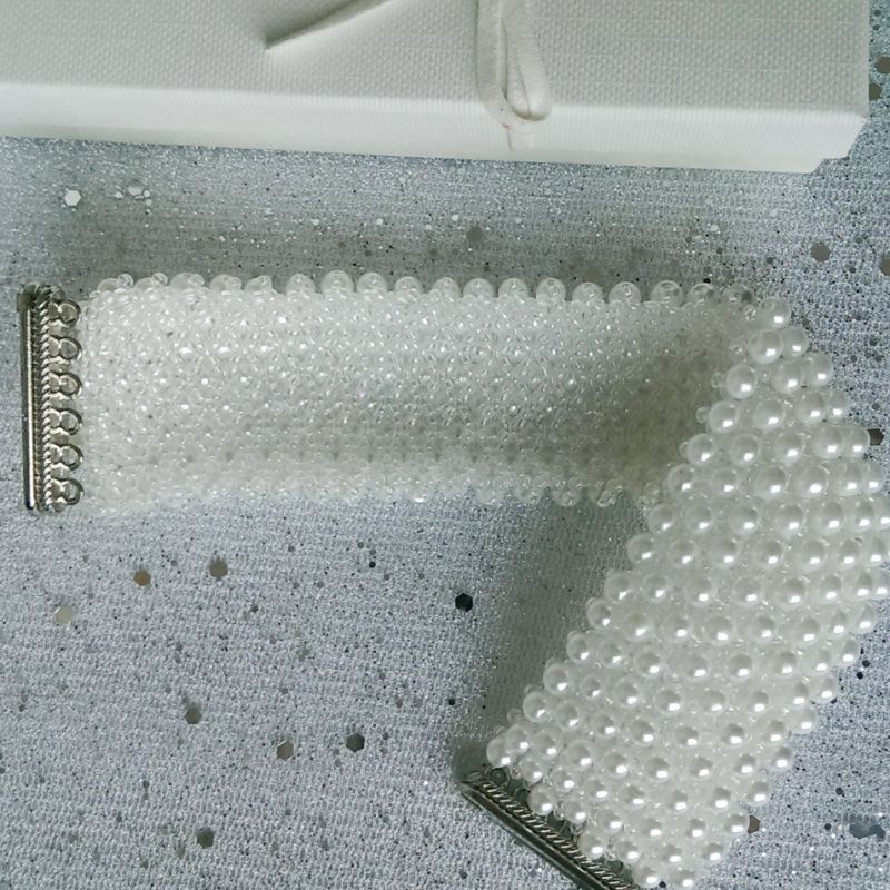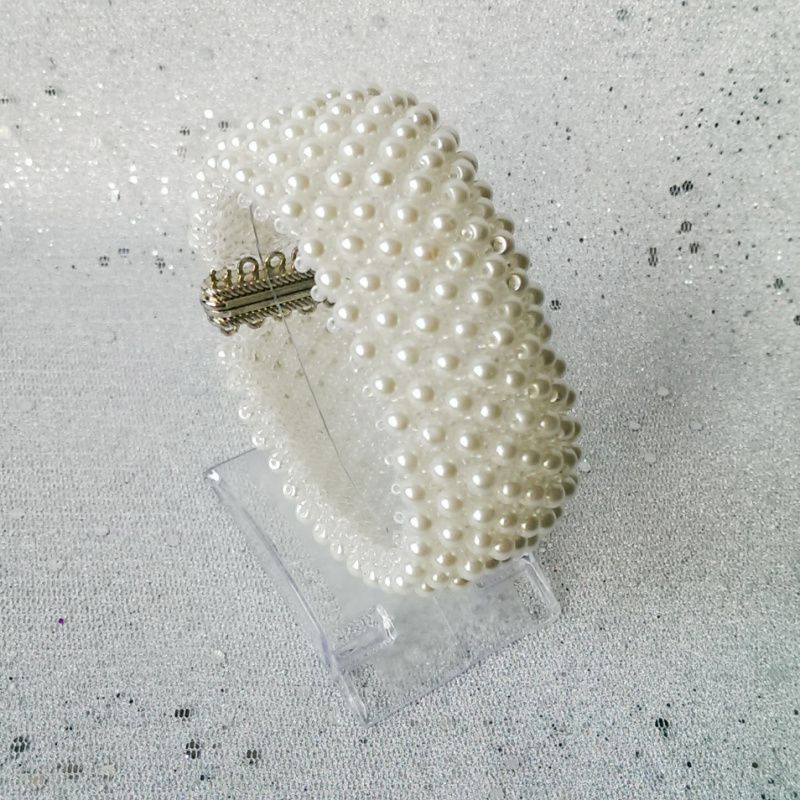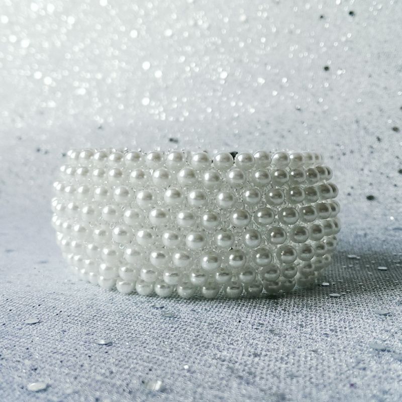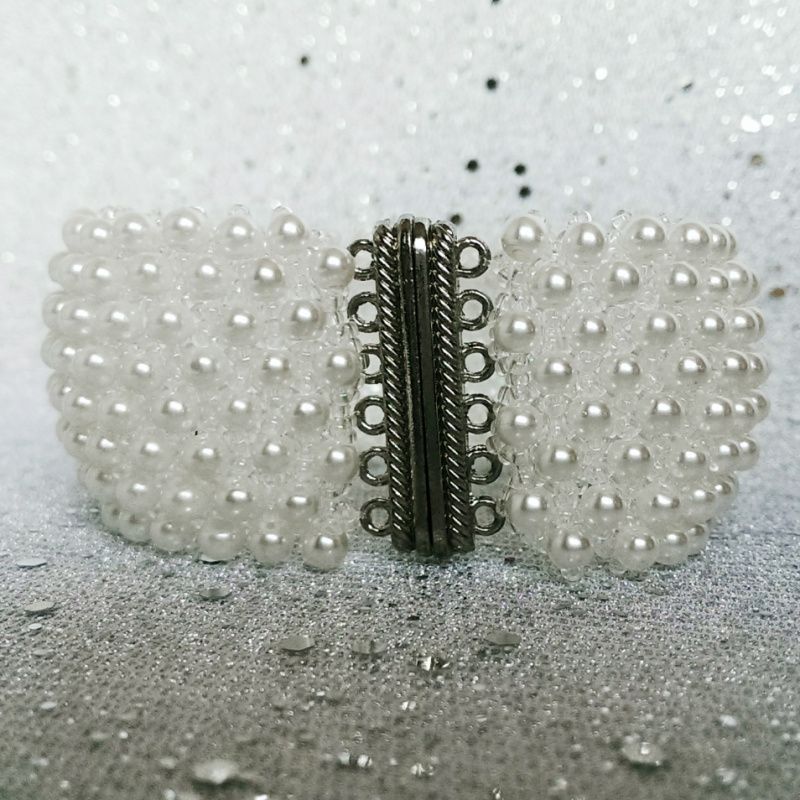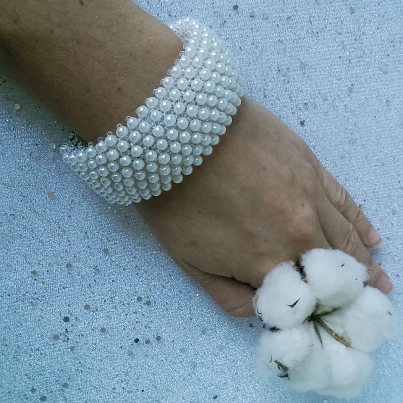 Широкий браслет пліток з чеського бісеру прозорого білого кольору і розшитий білими керамічними намистинами під перли. Браслет стане відмінним доповненням до весільного або вечірнього вбрання. Дуже вишукана прикраса! Браслет застібається міцним і зручним магнітним замком, будьте впевнені, в тому що він не розкриється раптово. Замок зручні, його легко застебнути і розстебнути самої.