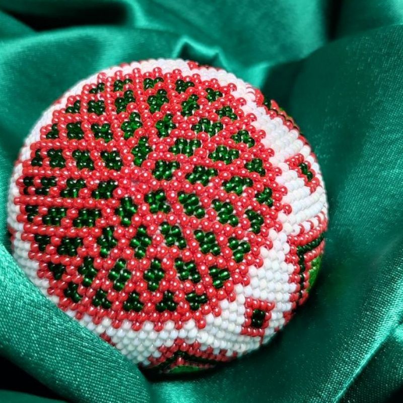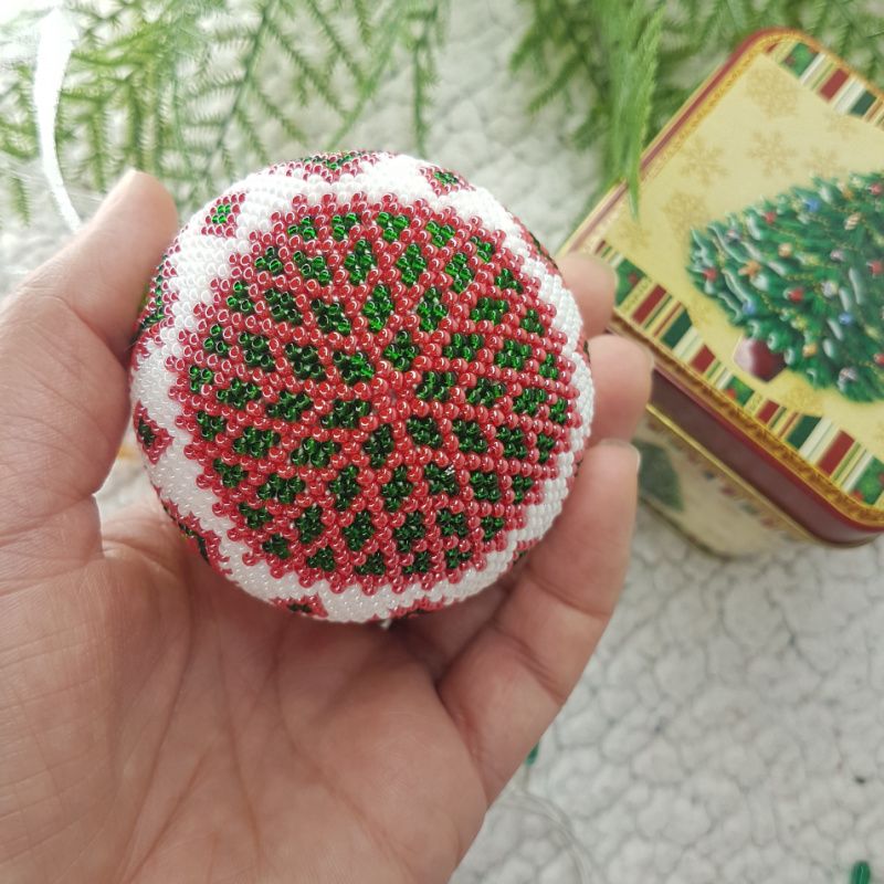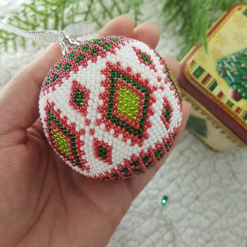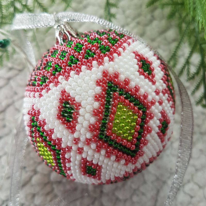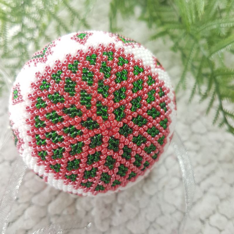 Новорічна кулька, в'язана гачком з бісеру. Діаметр 6,5 см. Такі іграшки не б'ються, Вам не потрібно переживати, якщо кулька впаде з ялинки. Всередині кульки основа з пінопласту. Ця ялинкова кулька стане чудовою прикрасою для Вашої новорічної ялинки. Також він може бути оригінальним подарунком для друзів, рідних чи колег по роботі. Рекомендації щодо догляду. Зберігати вдалині від сонячних променів та підвищеної вологості, в сухому місці, достатньо протерти вологою ганчіркою. Очищайте вироби сухою м'якою тканиною, між бісеринами забруднення можна видалити м'якою зубною щіткою. Не протирайте вироби спиртовими рідинами. Помити прикраси можна прохолодною водою без мила та засобів для чищення. Потім промокнути фланеллю.