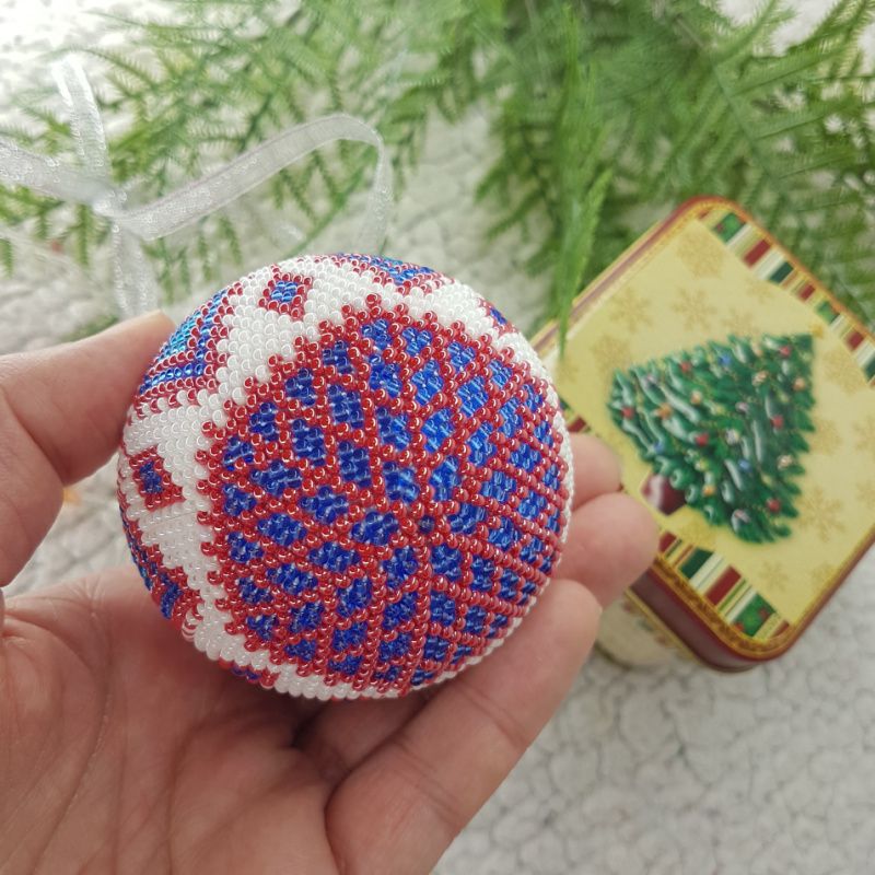 Новорічна кулька, в'язана гачком з бісеру. Діаметр 6,5 см. Такі іграшки не б'ються, Вам не потрібно переживати, якщо кулька впаде з ялинки. Всередині кульки основа з пінопласту. Ця ялинкова кулька стане чудовою прикрасою для Вашої новорічної ялинки. Також він може бути оригінальним подарунком для друзів, рідних чи колег по роботі. Рекомендації щодо догляду. Зберігати вдалині від сонячних променів та підвищеної вологості, в сухому місці, достатньо протерти вологою ганчіркою. Очищайте вироби сухою м'якою тканиною, між бісеринами забруднення можна видалити м'якою зубною щіткою. Не протирайте вироби спиртовими рідинами. Помити прикраси можна прохолодною водою без мила та засобів для чищення. Потім промокнути фланеллю.