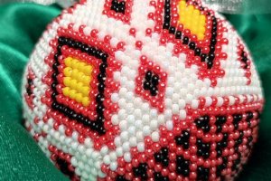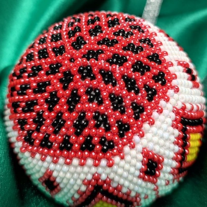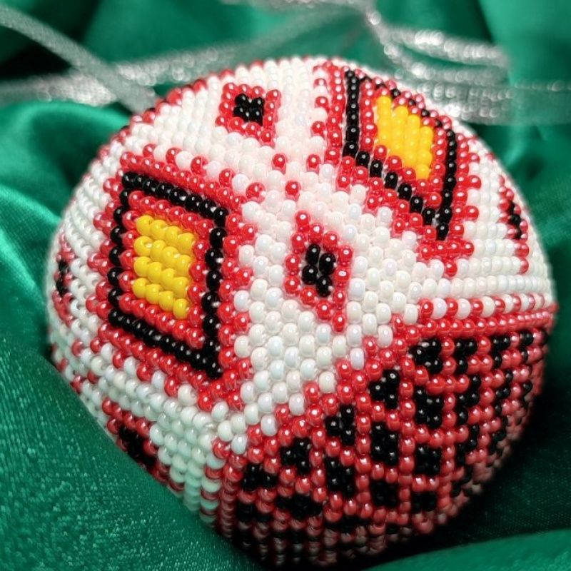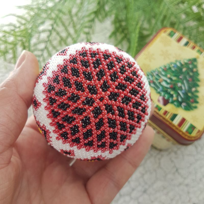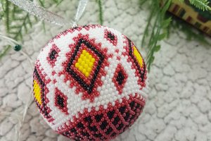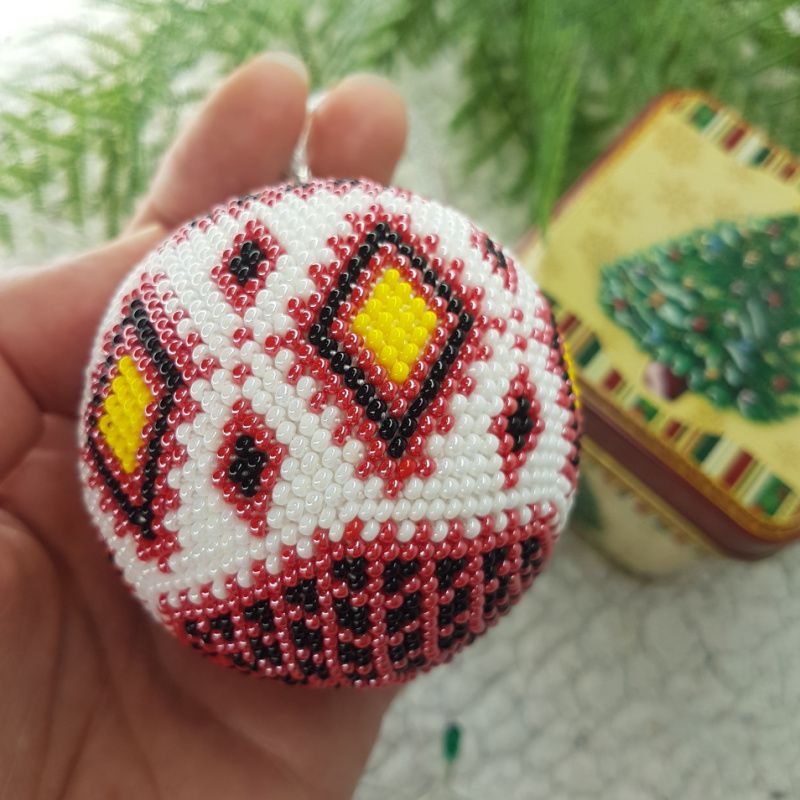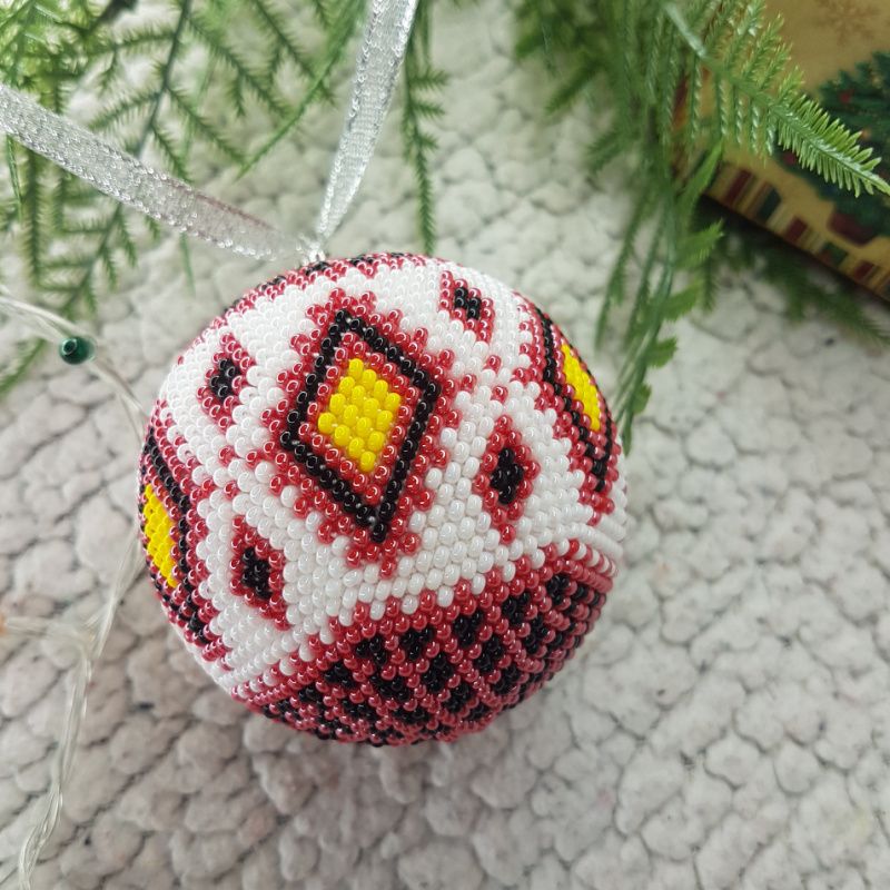 Новорічна кулька, в'язана гачком з бісеру. Діаметр 6,5 см. Такі іграшки не б'ються, Вам не потрібно переживати, якщо кулька впаде з ялинки. Всередині кульки основа з пінопласту. Ця ялинкова кулька стане чудовою прикрасою для Вашої новорічної ялинки. Також він може бути оригінальним подарунком для друзів, рідних чи колег по роботі. Рекомендації щодо догляду. Зберігати вдалині від сонячних променів та підвищеної вологості, в сухому місці, достатньо протерти вологою ганчіркою. Очищайте вироби сухою м'якою тканиною, між бісеринами забруднення можна видалити м'якою зубною щіткою. Не протирайте вироби спиртовими рідинами. Помити прикраси можна прохолодною водою без мила та засобів для чищення. Потім промокнути фланеллю.