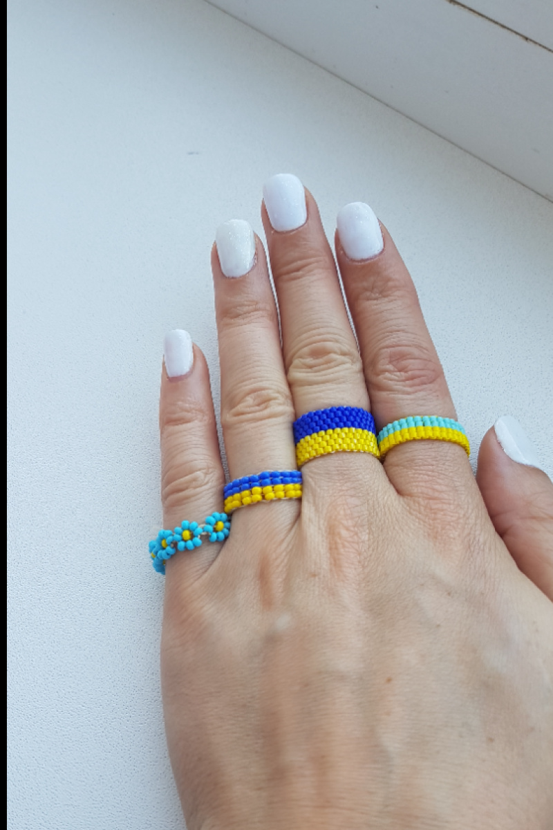 Матеріал різний. Тоненькі і з квіточками з чешського бісера. Широка каблучка- японськи бісер