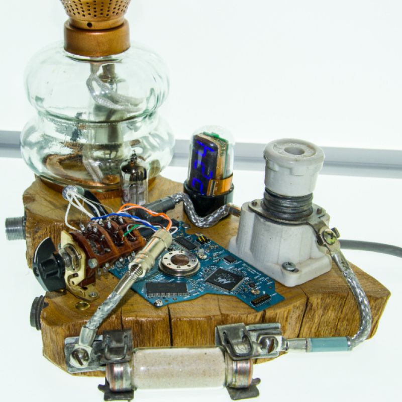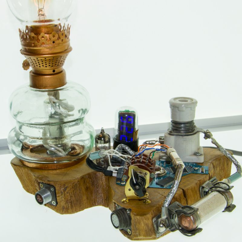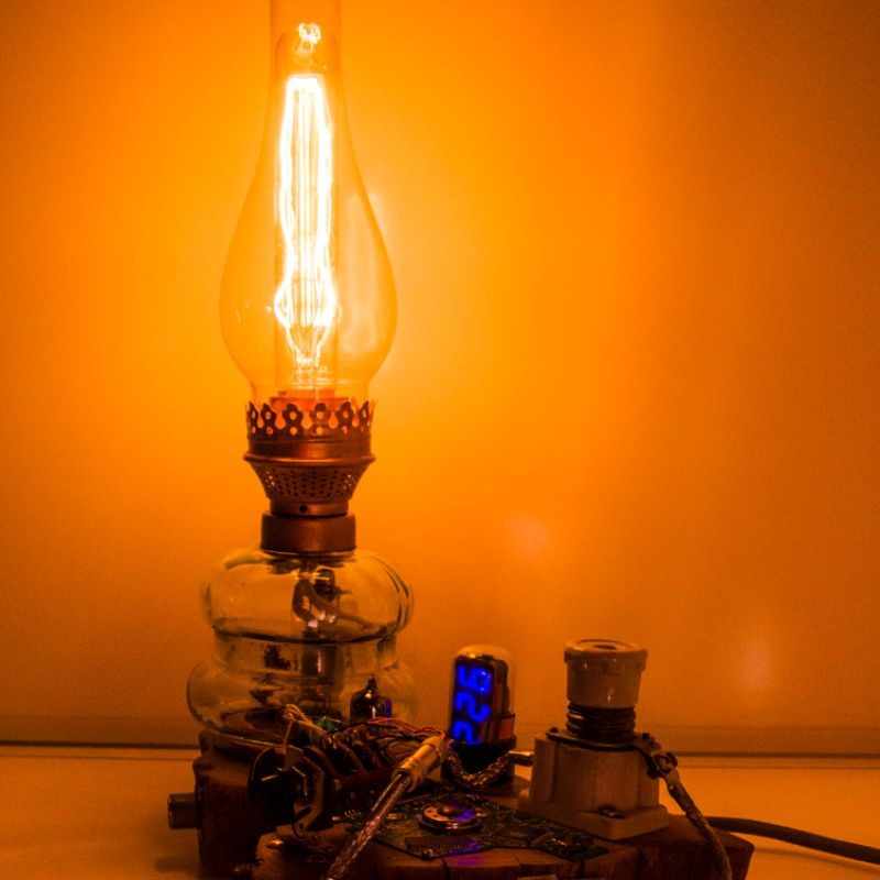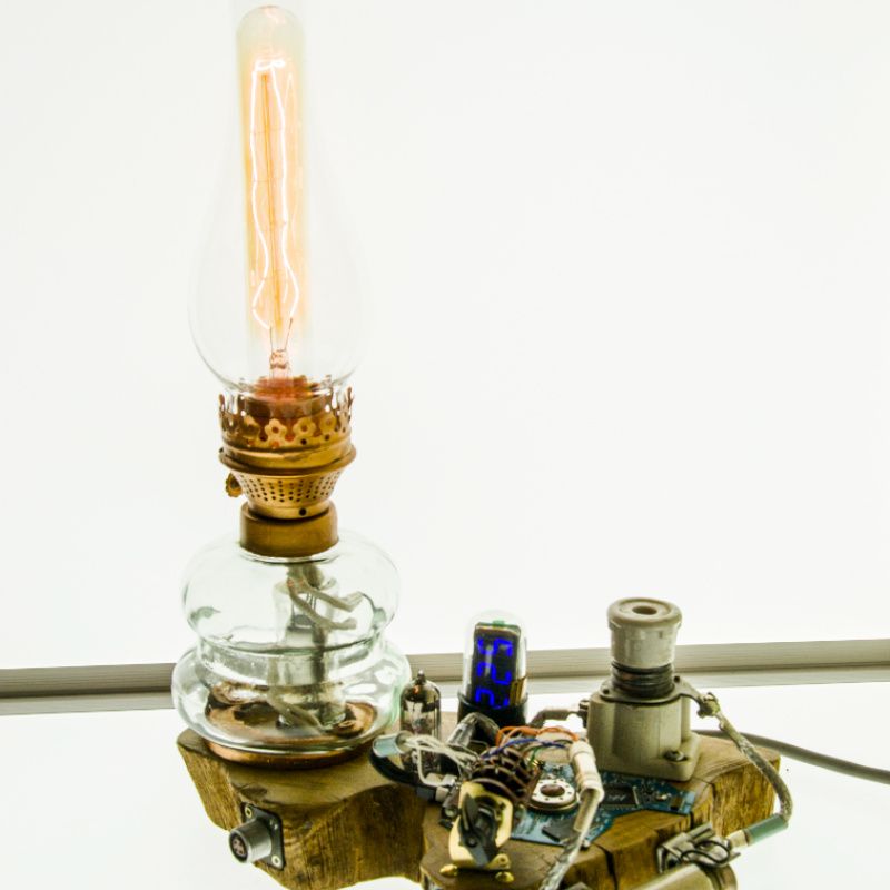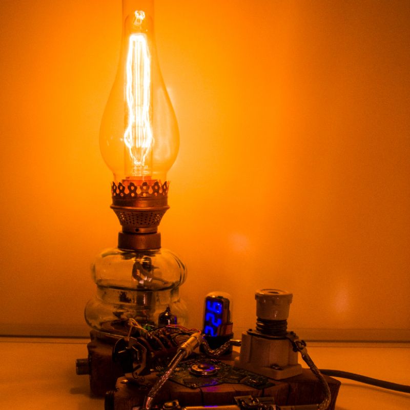 Незвичайна настільна лампа виконана у стилі стимпанк. Такий світильник стане не звичайною родзинкою будь-якого інтер'єру. Основами світловим елементом служить так звана «Лампа Едісона» на 40w. Ця лампа розжарювання створює не звичайне світіння, за необхідності просто змінюється. Також у конструкцію входити вольт-метр виконаний у вигляді старої лампи для радіо приладів. І не великий світлодіод зеленого кольору для підсвічування основи лампи. Основа виконана з цілісного масиву дерева. Всі деталі є не муляжем, а цілком справжніми елементами. Увімкнення лампи здійснюватиметься провертанням пробки. Діюча електропроводка знаходиться всередині приладу і не з'єднується із зовнішніми елементами. Електро пробка не замикає контакти, а тільки натискає на кнопку включення.