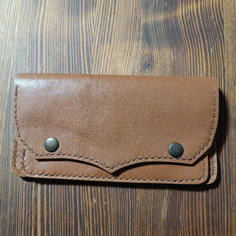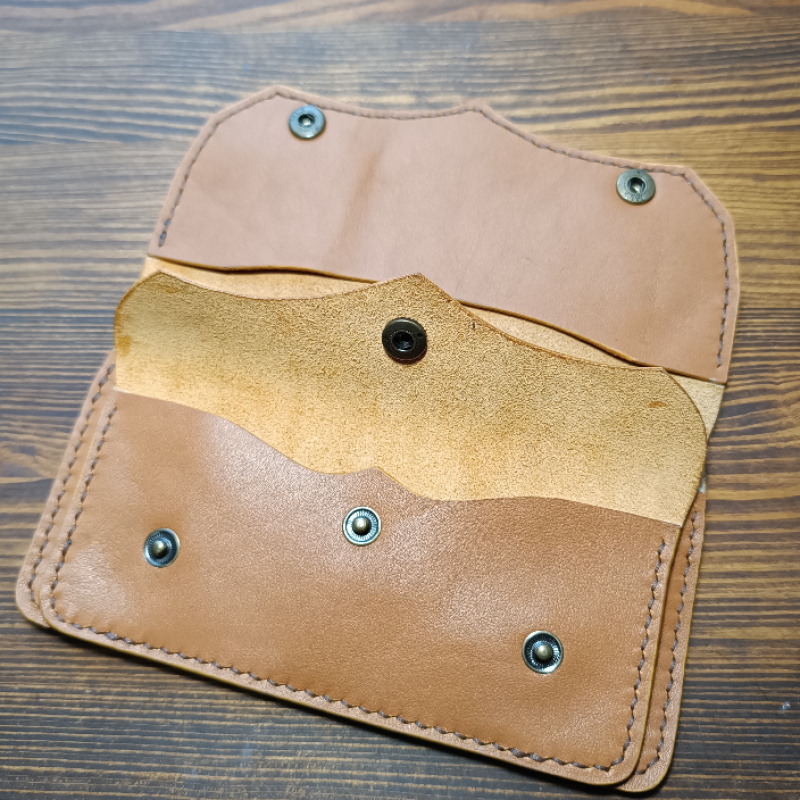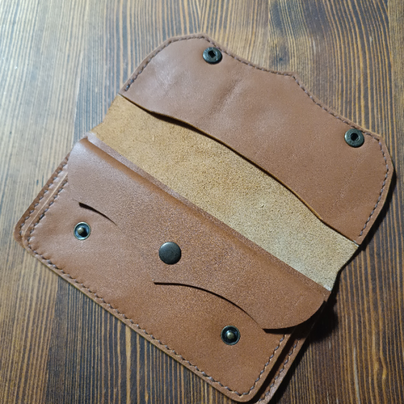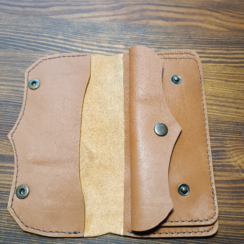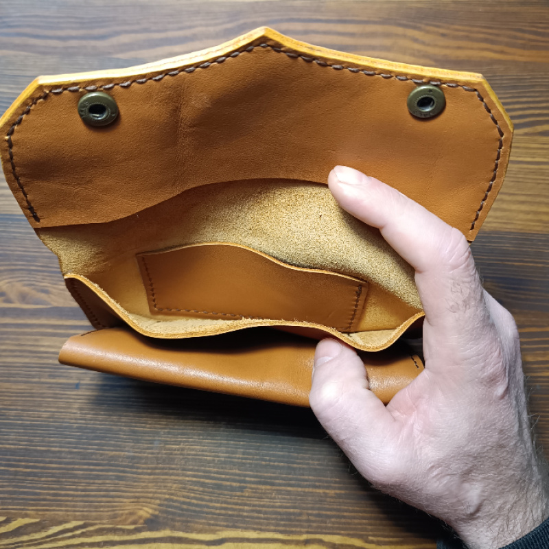 Шкіряний гаманець ручної роботи з натуральної італійської шкіри. Має одне відділення для купюр, два відділення для карток і одне відділення для монет на кнопці.