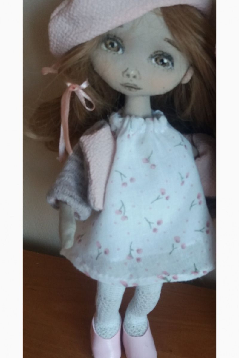Лялька текстильна,одяг знімається, ручки і ніжки згинаються ,додається ще одне платтячку у подарунок,кофточку і берет можна одягати на дві сторони