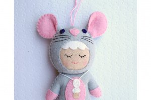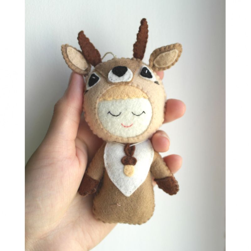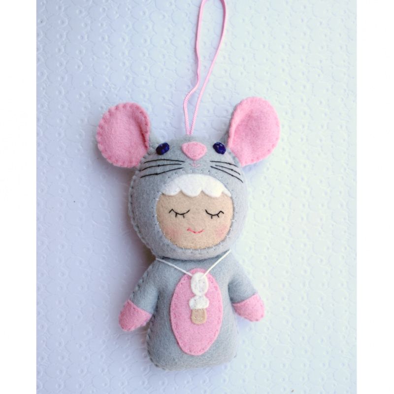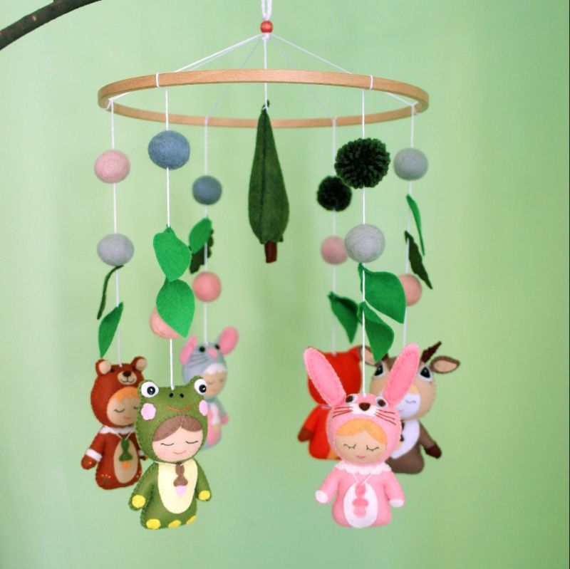 Авторський мобіль на ліжечко з веселими малюками в костюмчиках лісових звіряток: ведмедик, лисичка, мишеня, жабка, зайчик та оленятко. Різнобарвний та деталізований.