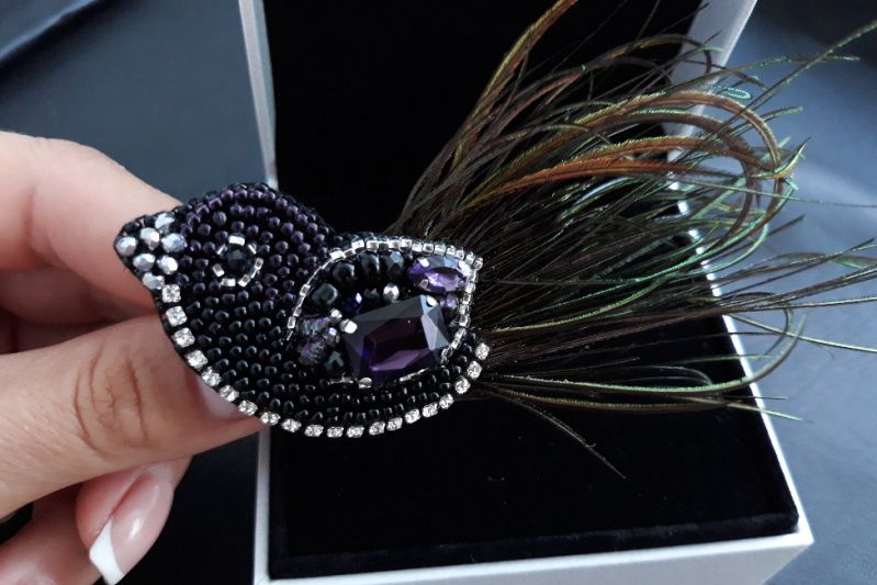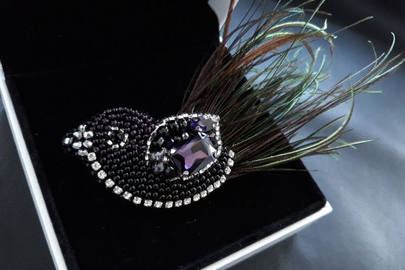 Брошка "ПТАХА" створена із кристалів в оправах, скляних бусинок, чеського бісеру, ланцюжка з кристаликами, екошкіри та пір'їнок павича.