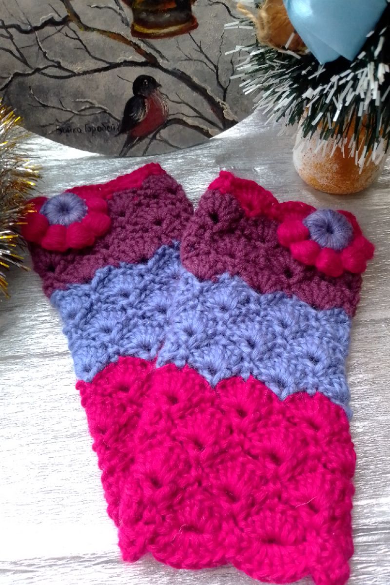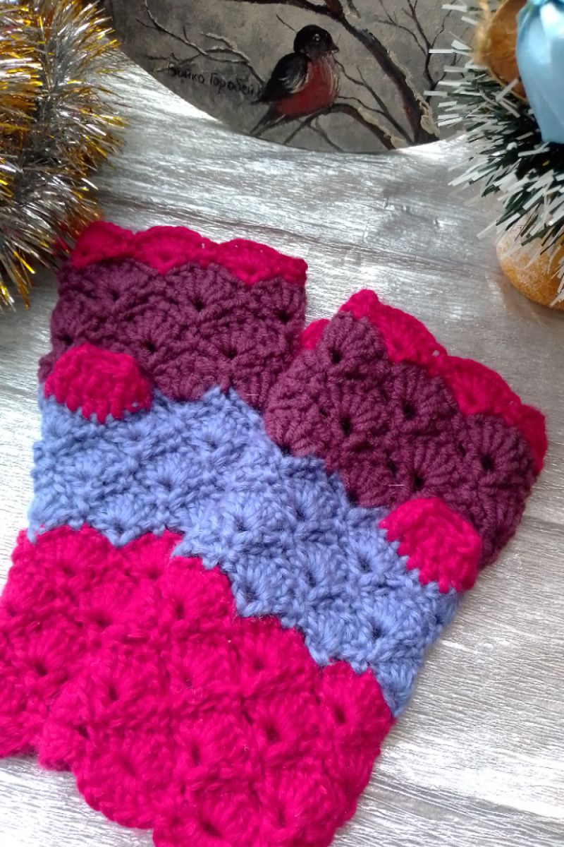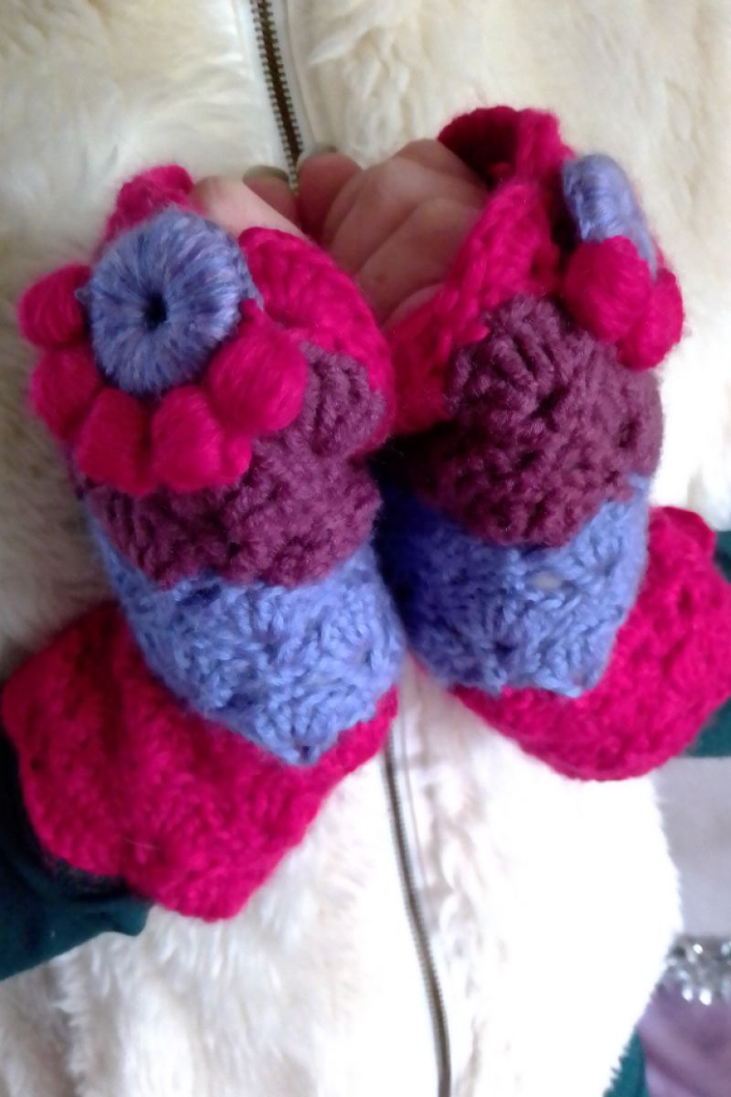 Яскраві теплі мітенки сплетені гачком. Пряжа м'яка, не колюча. На обхват долоні 19-20 см. Довжина мітенки 20 см.