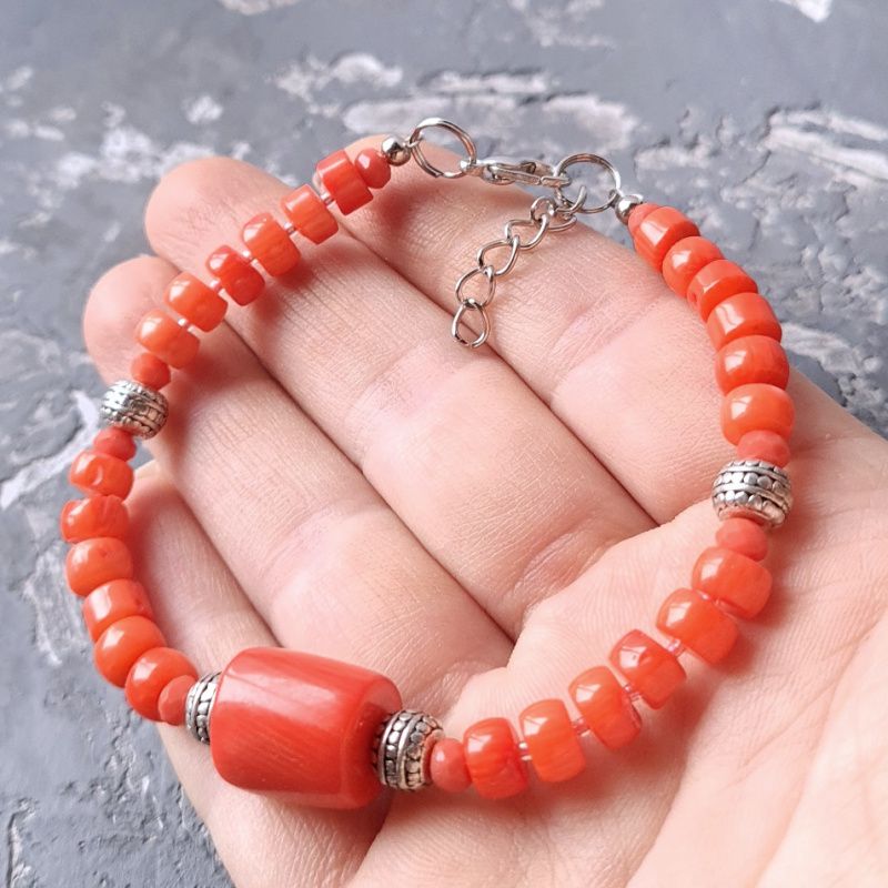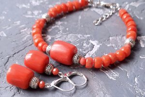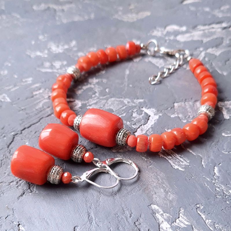 Браслет та сережки з натуральними коралами кольору лосось та кришталевими граненими намистинками в тон до коралу. Цей відтінок використовувася у старовинних коралах, тому, при створенні цього комплекту було обрано мінімалістичний дизайн "під старовину".