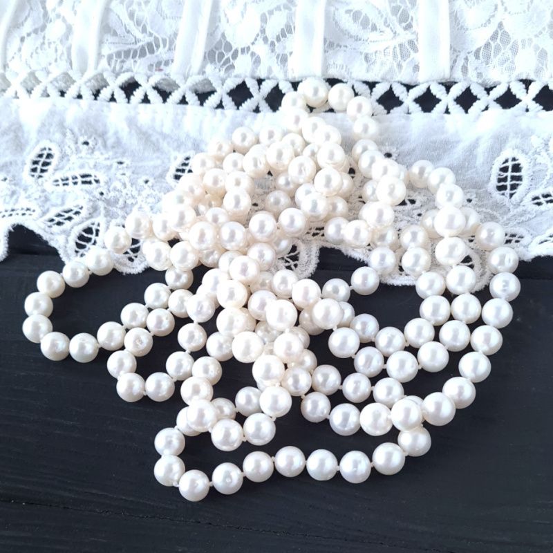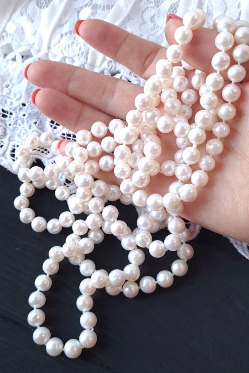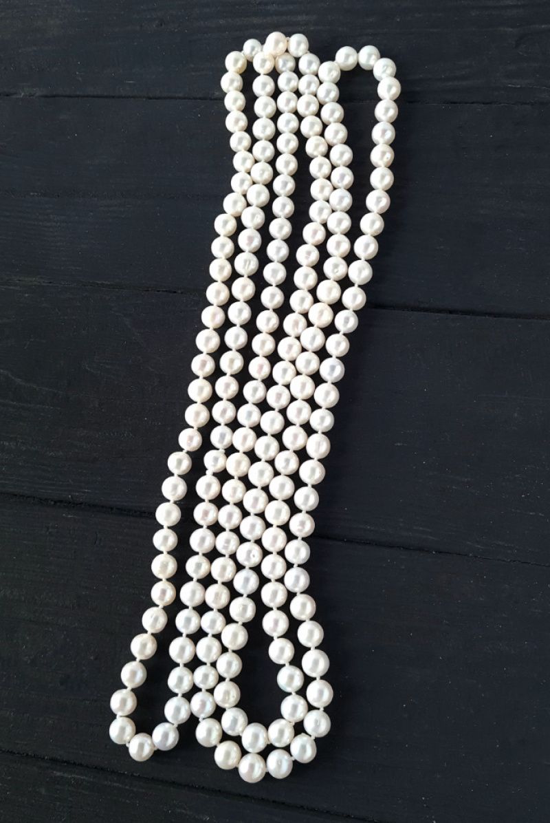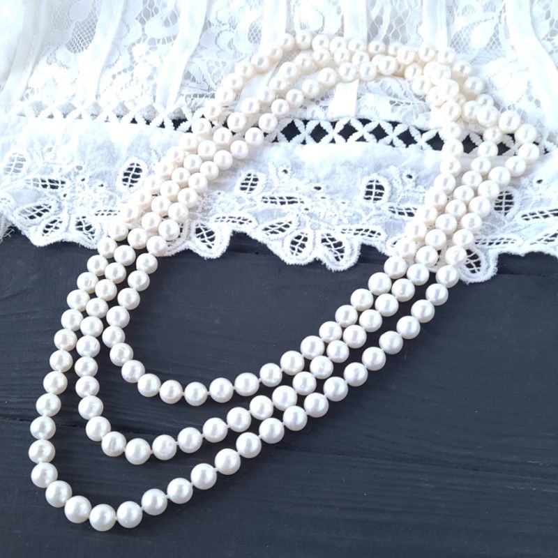 Намисто з натуральних білих перлів високого класу, перенизане через вузлик. Вартість вказана за намисто як на фото, довжиною 150 см. Розмір перлин на фото: 8-7.5 мм. На замовлення - інший розмір. Намисто розкішне можна носити у одну довгу нитку, дві або навіть 3 оберти. Роблю таке чи інше намисто з перлів, потрібної вам довжини, з застібкою чи без. На замовлення застібка може бути звичайна, або зі срібла 925 проби, позолота по сріблу чи золото. Розмір перлин, клас і довжина - все на ваше замовлення. Кінцева вартість буде залежати від усіх побажань покупця. На інших фото є підвіска- китиця з перлами Swarovski, яка не входить у вартість, але може бути замовлена окремо. Така китиця може бути пристібнута окремо на це намисто, або ж на сумку, клатч, на пояс, чи як моно сережка. До кольє також можна замовити браслет чи сережки.