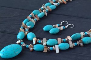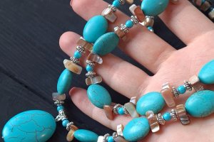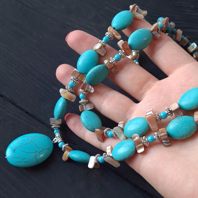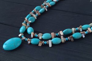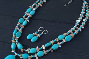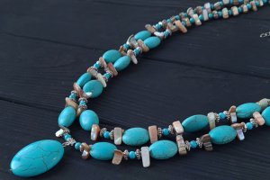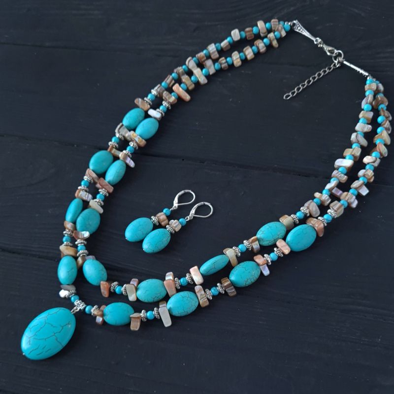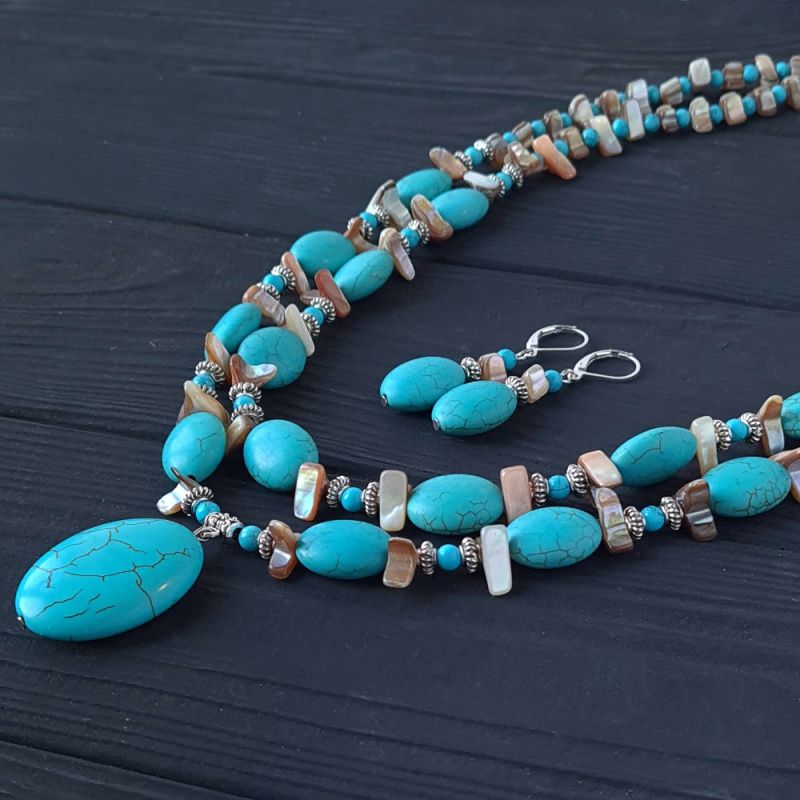 Намисто дворядне з натуральними перламутрами та бірюзою говліт.
