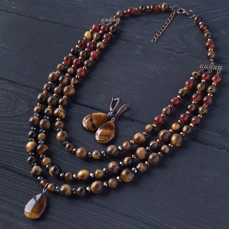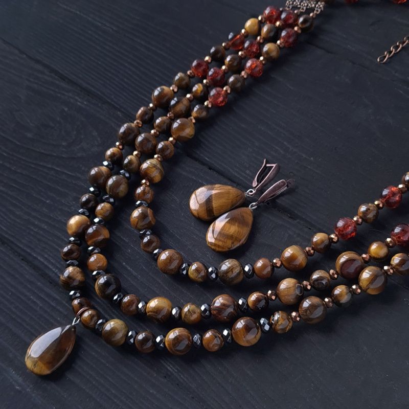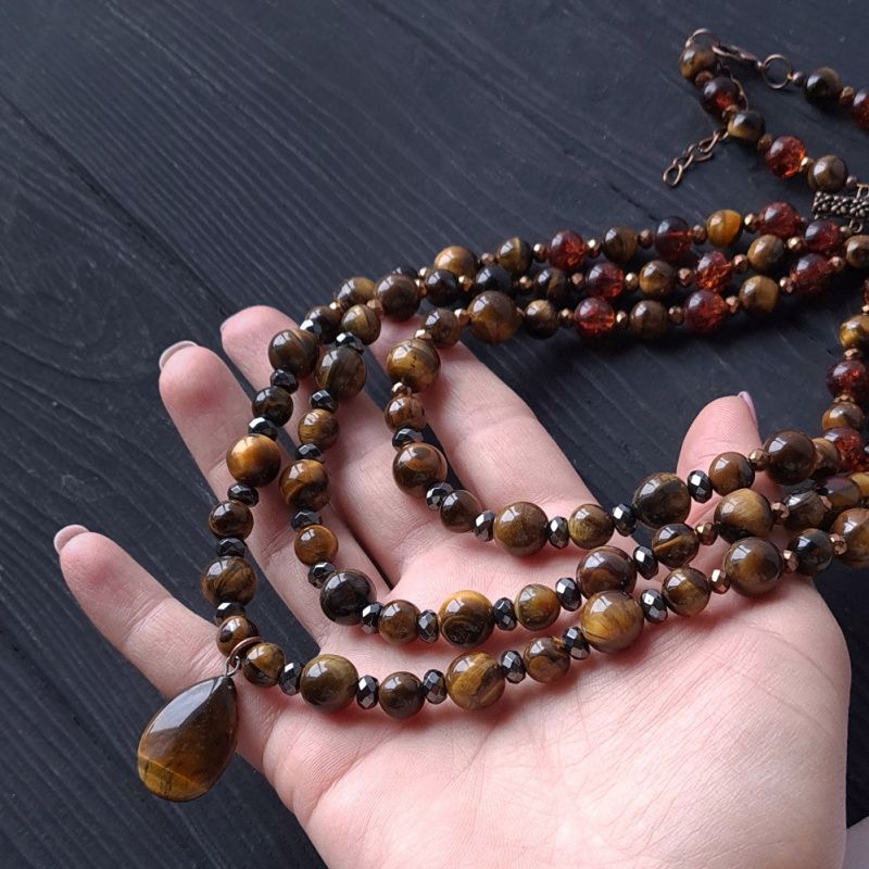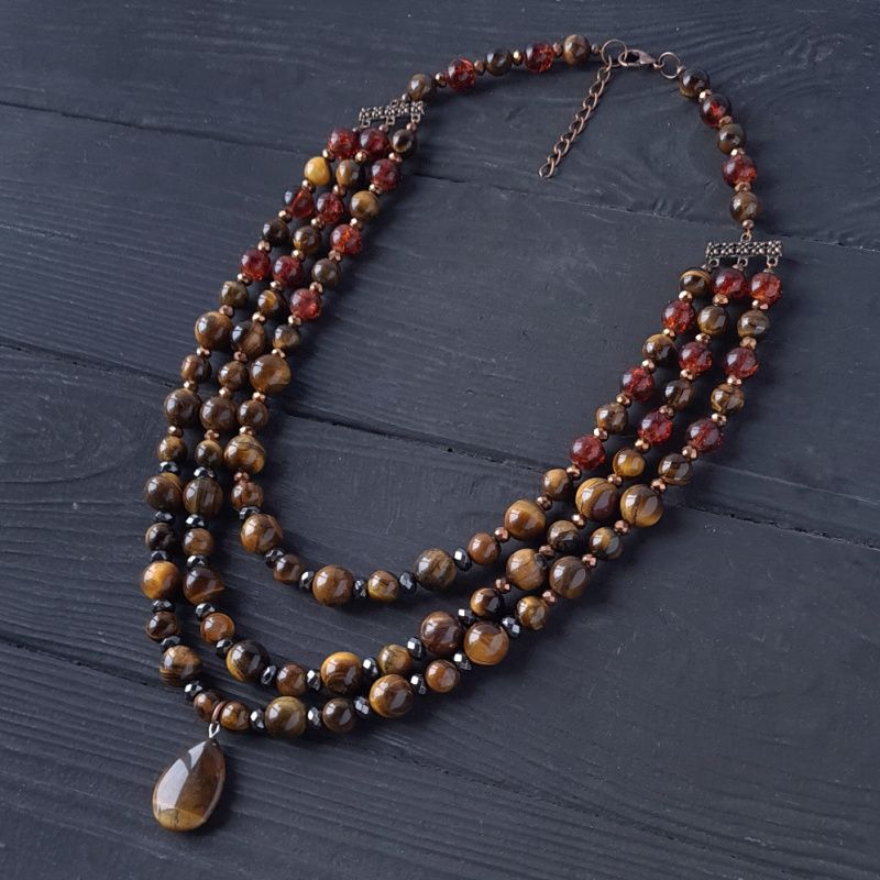 Трьохрядне кольє з натуральних каменів тигряче око та гематит. Класичне поєднання коричневого, металічно-чорного та золотого - розкішна прикраса для стильної жінки, що полюбляє класику та чіткість форм. Вартість вказана за намисто як на фото, довжина верхньої нитки: 45 см , середньої: 47 см, нижньої: 50 см У намисті встановлено подовжуючий ланцюжок плюс 5 см. Тому ви самостійно можете регулювати його довжину. Я можу зробити для вас будь-яку іншу довжину намиста, потрібну вам! Вартість буде перерахована згідно потрібної вам довжини. На інших фото є сережки, що не входять у варість, але можуть бути замовлені окремо. До кольє можу зробити браслет за вашими побажаннями.