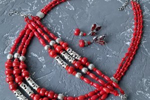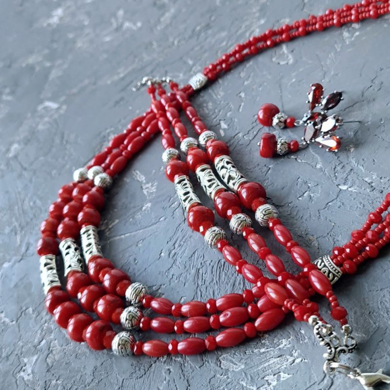 Комплект прикрас з натуральних коралів: Намисто трьохрядне та браслет.