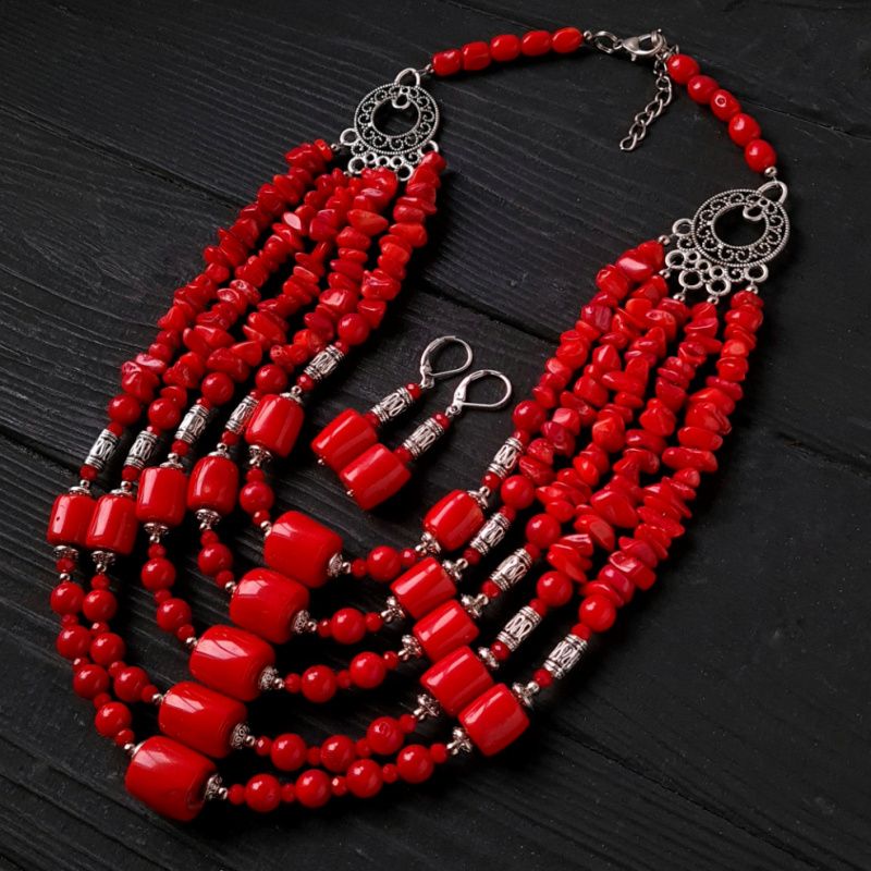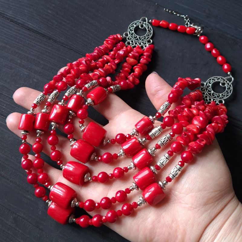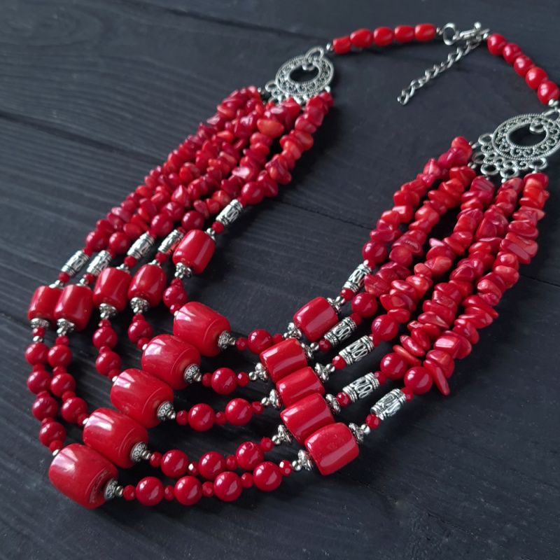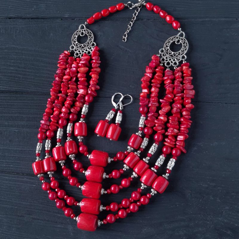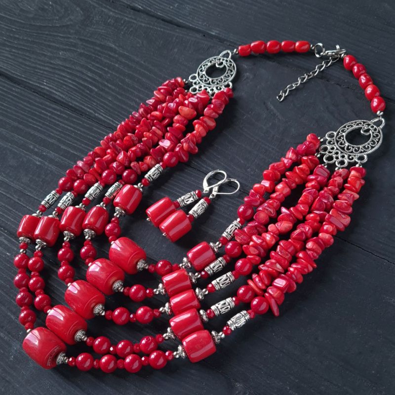 Комплект прикрас: намисто та сережки з натуральних коралів та гранених кришталевих намистинок. Застібки сережок: срібло 925 проби. Гарне намисто та сережки під вишиванку, білу чи чорну блузку, сукню або навіть звичайну сорочку - прекрасний подарунок вашій жінці, дружині, подрузі, мамі, сестрі на день народження чи коралове весілля. Вартість вказана за комплект: намисто, довжиною верхньої низки: 45 см,плюс 2 см кожна наступна низка, та сережки. На кінці намиста є подовжуючий ланцюжок +5 см, щоб ви самостійно могли регулювати довжину намиста. На замовлення можу зробити будь-яку іншу, потрібну вам довжину. Вартість буде перераховано згідно потрібної вам довжини. До намиста у комплект можу зробити браслет. Можна придбати прикраси окремо.