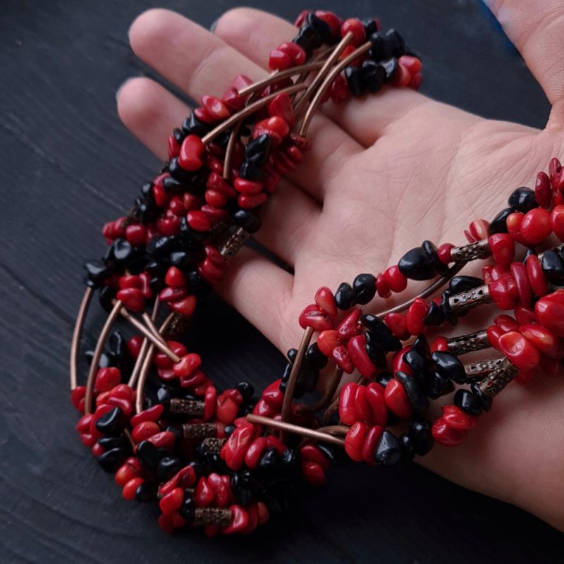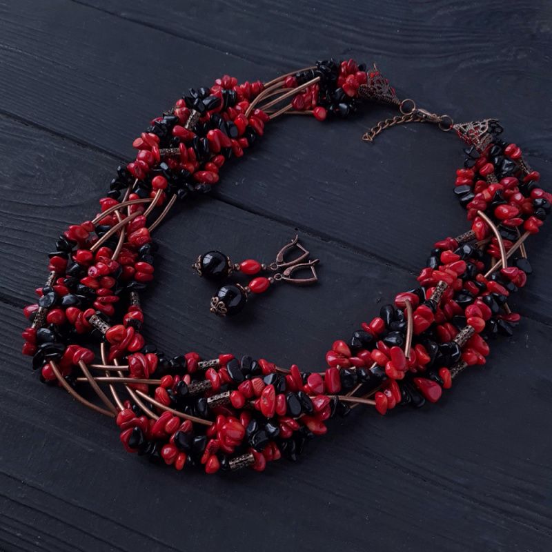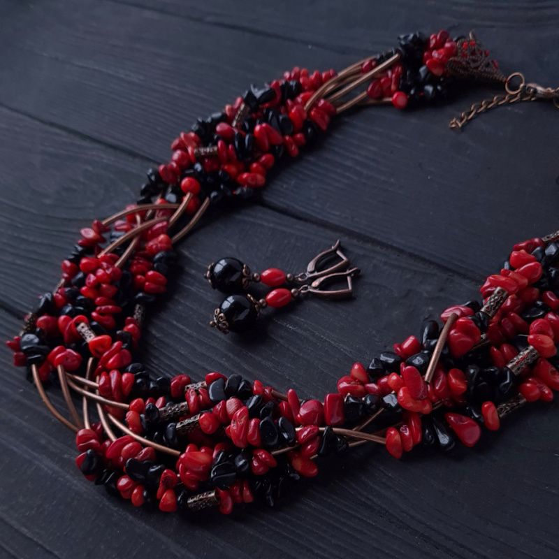 Комплект з натуральних коралів та натуральних чорних агатів: семирядне намисто і сережки.