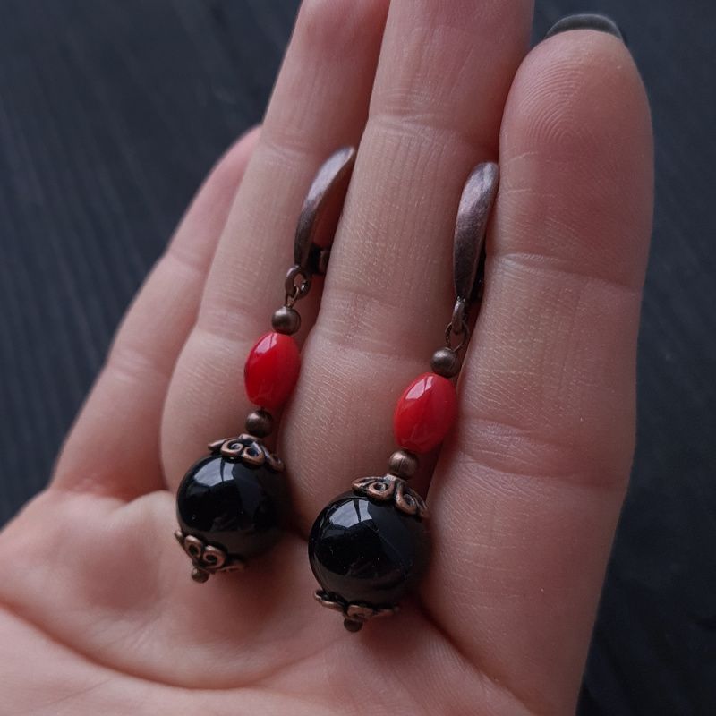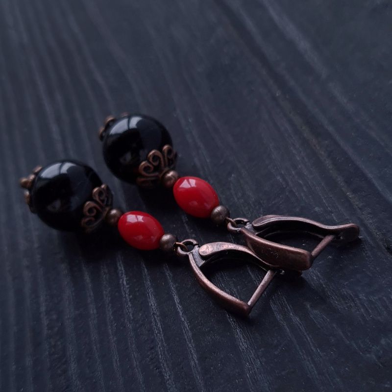 Фурнітура кольору зістареної міді. Вартість вказана за намисто як на фото, довжиною 45 см+5 см подовжуючий ланцюжок ( щоб ви могли самостійно обирати потрібну вам довжину) та сережки.