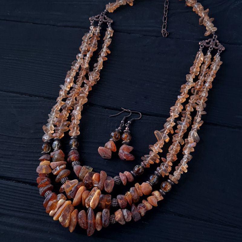 Комплект прикрас: трьохрядне намисто з натурального необробленого бурштину (янтаря) та сережки.