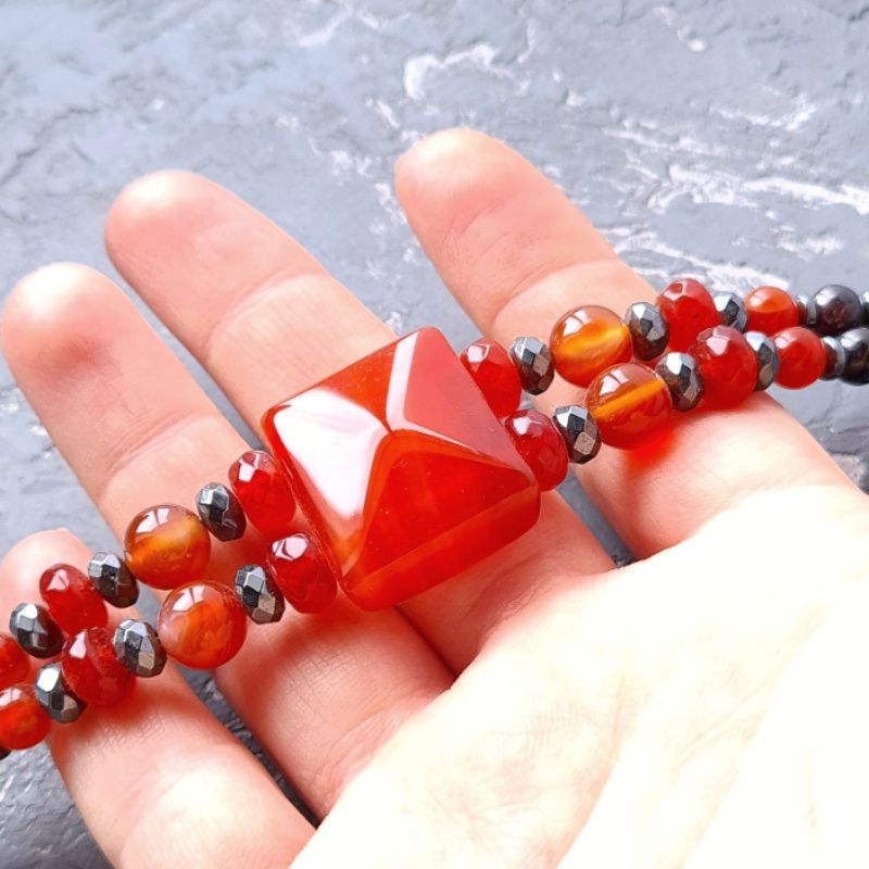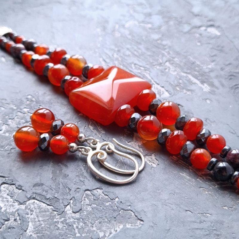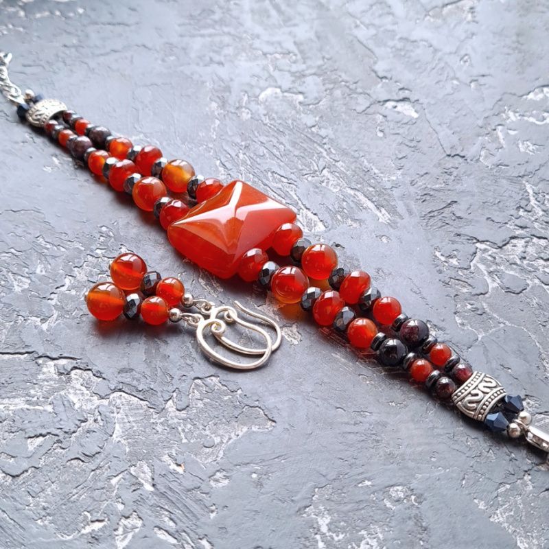 Комплект : браслет та сережки з натурального сердоліку. Довжина браслета регулюється за допомогою подовжуючого ланцюжка. В сережках застібки срібло 925 проби. Є продаж окремо. У комплект також можу зробити для вас аналогічне намисто на 1-2 низки - за вашими побажаннями. На останньому фото є святковий футляр з натурального дерева, який не входить у вартість, але може бути замовлений окремо.