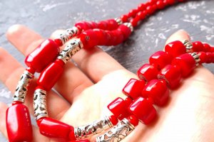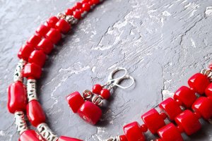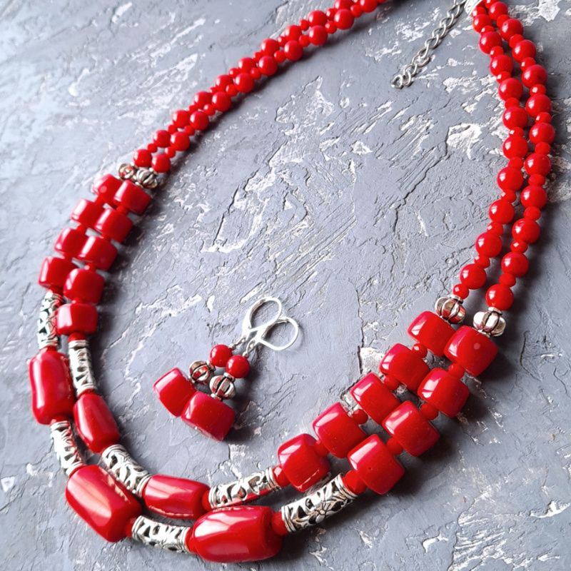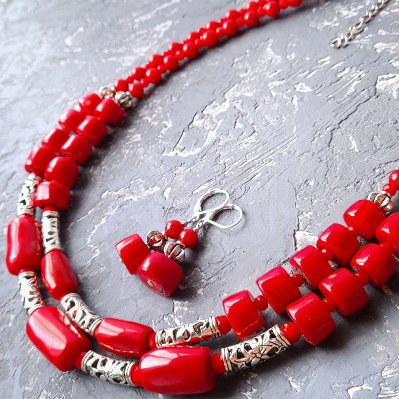 Комплект прикрас: Намисто та сережки з великими натуральними коралами з металічними вставками та квітковим орнаментом. Застібки сережок: срібло 925 проби. Гарне намисто та сережки під вишиванку, білу чи чорну блузку, сукню або навіть звичайну сорочку - прекрасний подарунок вашій жінці, дружині,подрузі, мамі, сестрі на день народження чи 8 березня Вартість вказана за комплект: намисто, довжиною верхньої низки: 45 см, нижньої низки: 48 см та сережки. На кінці є подовжуючий ланцюжок +5 см, щоб ви самостійно могли регулювати довжину намиста. На замовлення можу зробити будь-яку іншу, потрібну вам довжину. Вартість буде перераховано згідно потрібної вам довжини. До намиста у комплект можу зробити браслет. Можна придбати прикраси окремо. На останньому фото є святковий футляр з натурального дерева, який не входить у вартість, але може бути замовлений окремо.