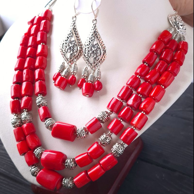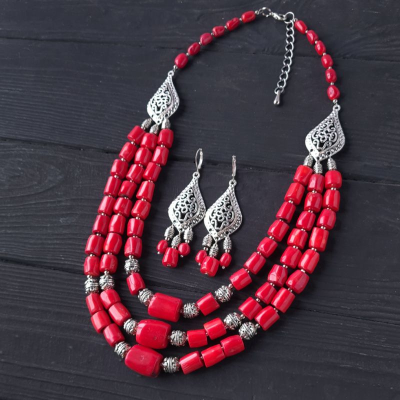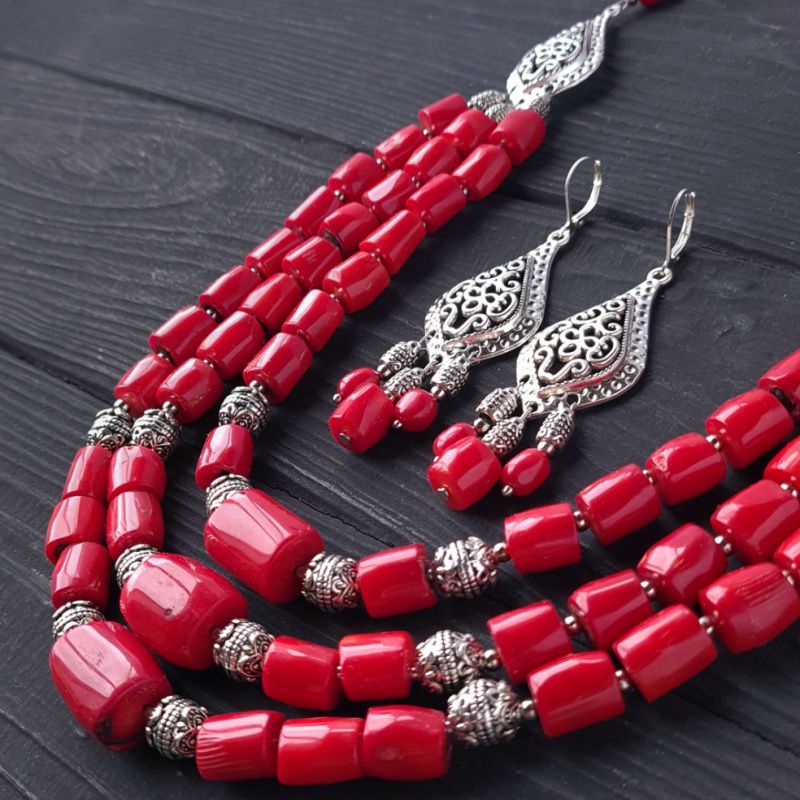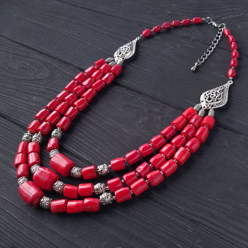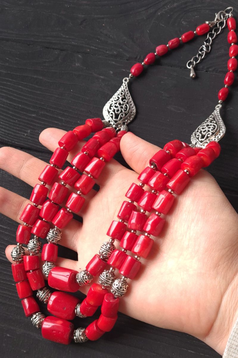 Стильне трьохрядне намисто з натуральних коралів. На коралах є чорні цяточки, рисочки та дірочки, що й є ознакою натуральності, що додає особливого шарму прикрасам і відчуття "живого" каменю. Якщо вам потрібне "ідеальне" намисто- замовляйте його з імітації коралу чи скляних намиистин. Довжина намиста узгоджується при оформленні покупки. Вартість вказана з урахуванням базової довжини намиста як на фото, по обхвату шиї 49 см+5 см подовжуючий ланцюжок. Кожний наступний ряд +2 см. Якщо вам потрібна інша довжина - вартість буде перерахована відповідно до потрібної довжини. На інших фото також є браслет та сережки, що не входять у вартість, але можуть бути замовлені окремо.
