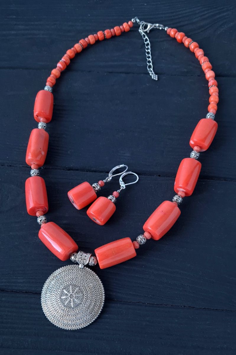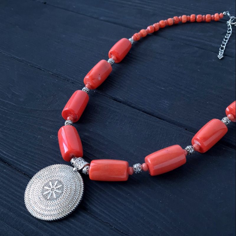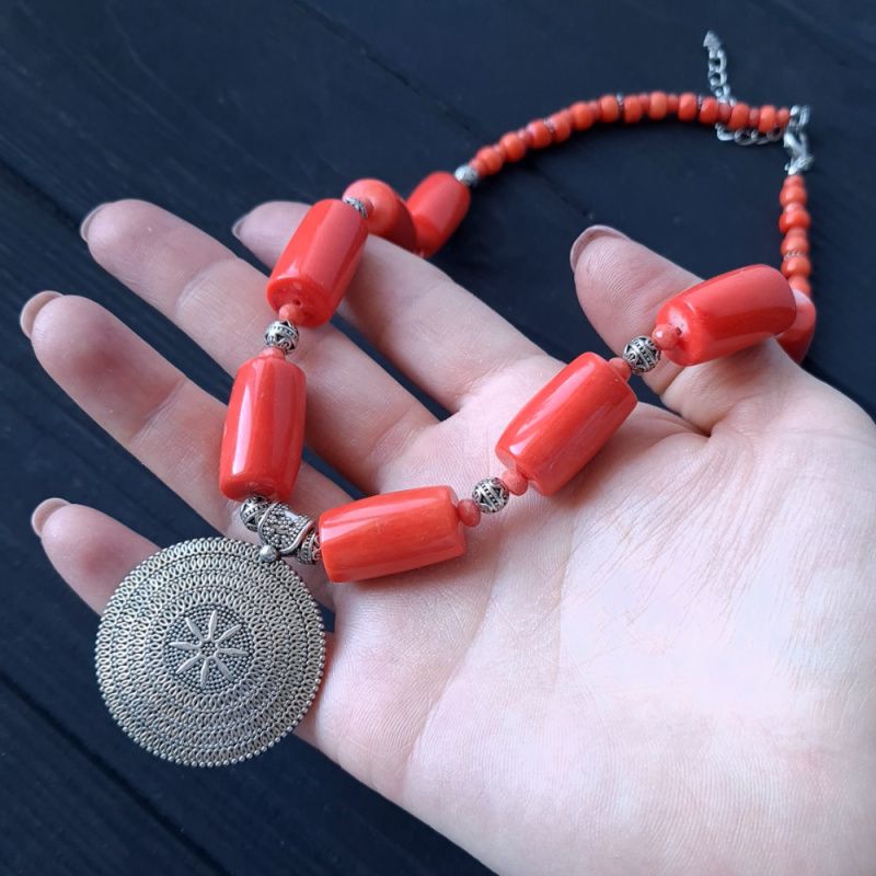 Стильне намисто з натуральних коралів з підвіскою, оздобленою квітковим орнаментом. Довжина намиста узгоджується при оформленні покупки. Вартість вказана з урахуванням базової довжини намиста як на фото, по обхвату шиї 45 см+5 см подовжуючий ланцюжок. Можете замовити аналогічне намисто на 2 чи 3 низки. Якщо вам потрібна інша довжина - вартість буде перерахована відповідно до потрібної довжини. На інших фото також є сережки, що не входять у вартість, але можуть бути замовлені окремо.