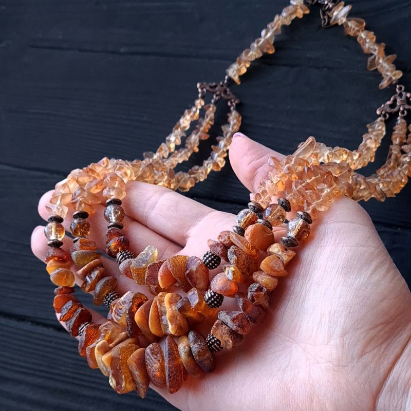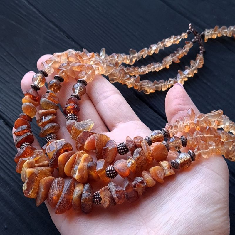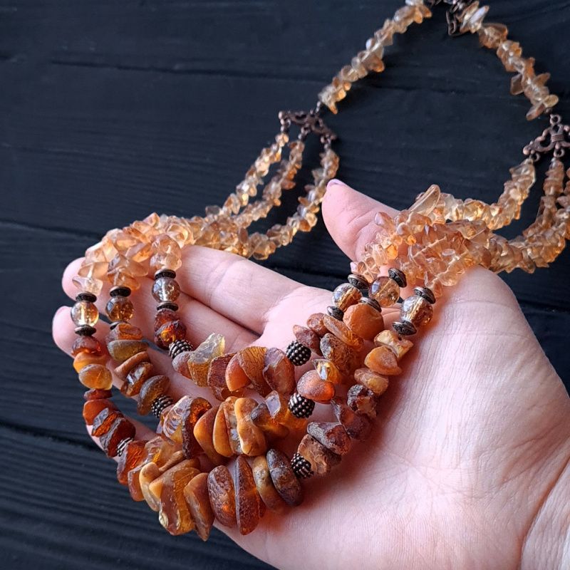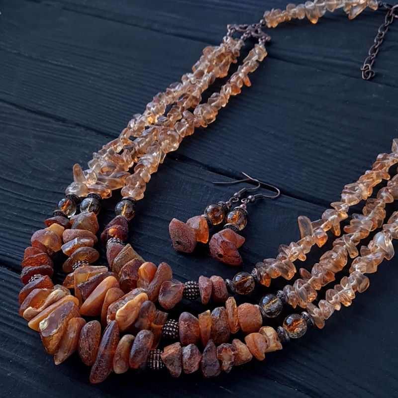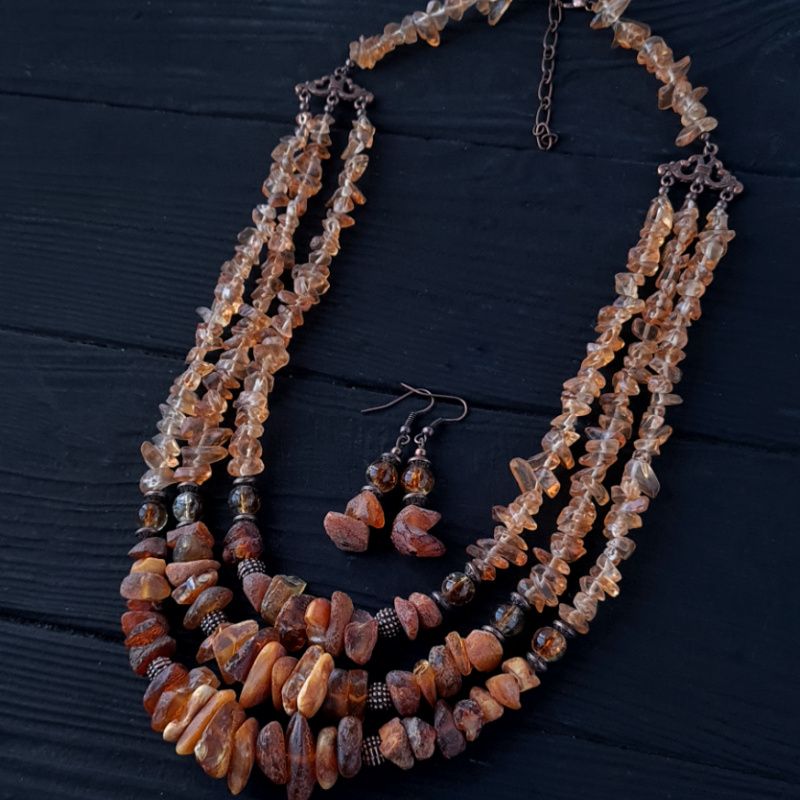 Трьохрядне намисто з натурального необробленого бурштину (янтаря) по центру, та тонованого кварцу - по боках. Розмір намистин бурштину: від 22 до 10 мм.