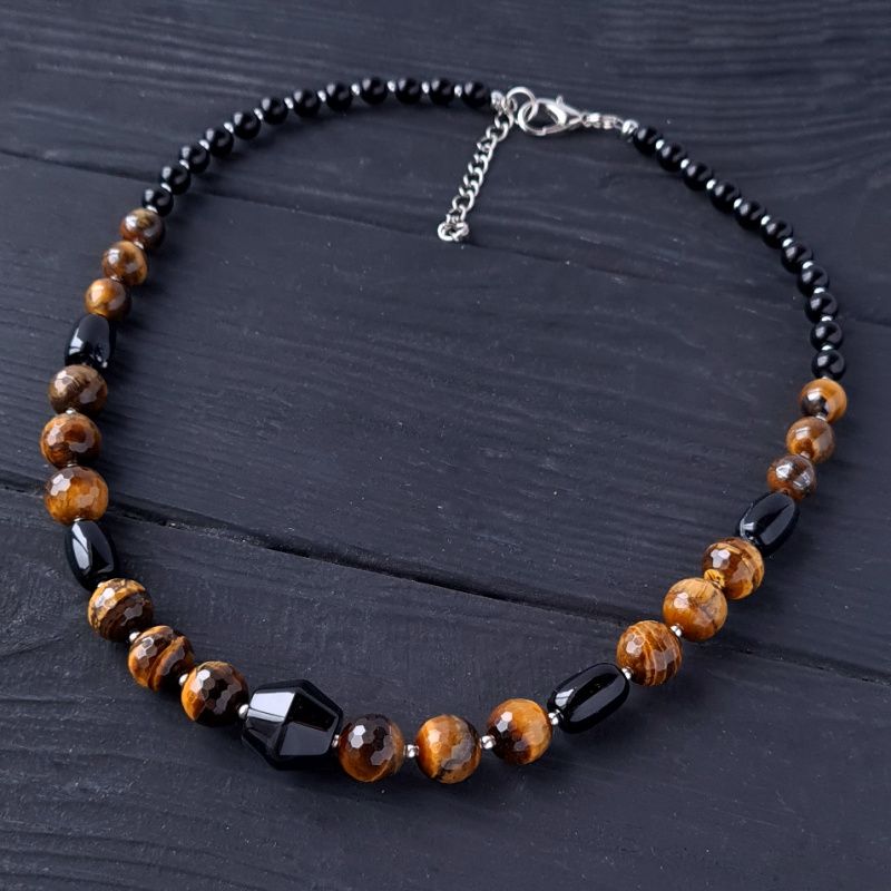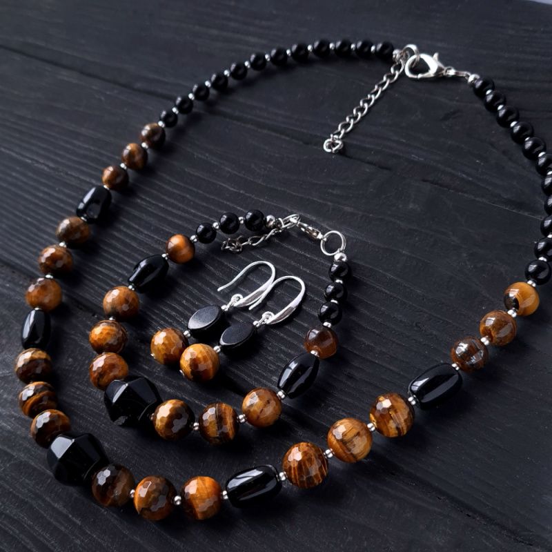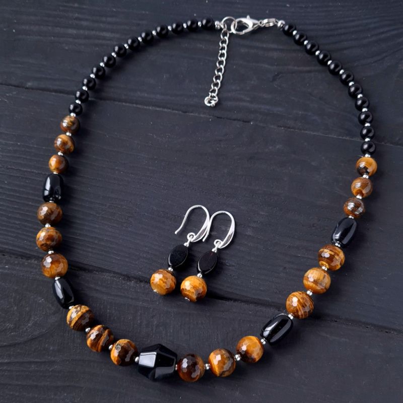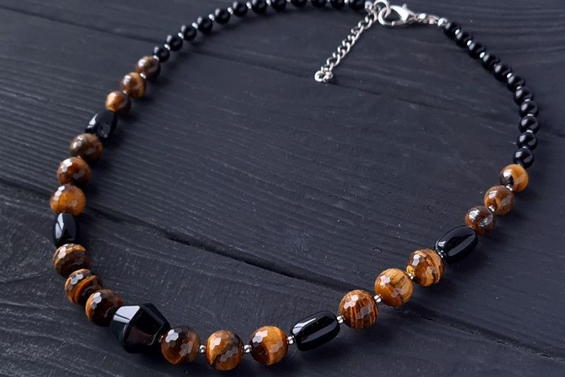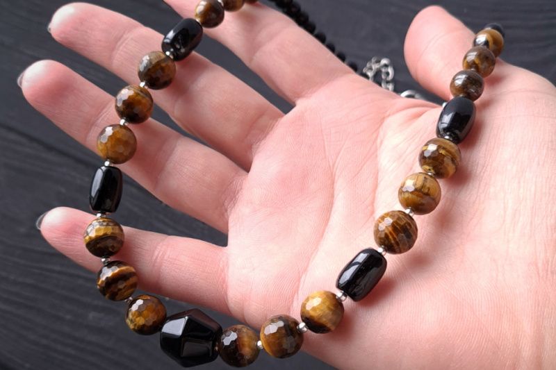 Стильне намисто з натуральних каменів тигряче око ювелірної огранки та чорний агат - ідеальний подарунок на новий рік Тигра 2022. Прикраси з натуральних каменів тигрячого ока доповнять святковий образ кожної жінки, дружини, дівчини, мами. На каменях зустрічаються цяточки, рисочки, ямки- що є підтвердженням натуральності каменів, і надає прикрасам особливого неповторного шарму. Класичне поєднання чорного, коричневого та золотого - для жінки, яка полюбляє лаконічність та чіткість форм. Вартість вказана за намисто як на фото, довжиною 45 см. У намисто встановлено подовжуючий ланцюжок плюс 5 см, щоб ви могли самостійно регулювати його довжину. Я можу зробити для вас будь-яку іншу довжину намиста, потрібну вам. Вартість буде перерахована згідно необхідної вам довжини. На інших фото є браслет та сережки, що не входять у вартість, але можуть бути замовлені окремо.