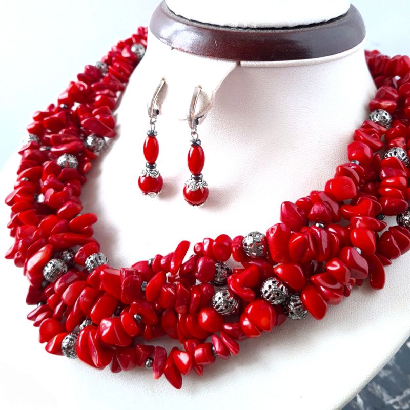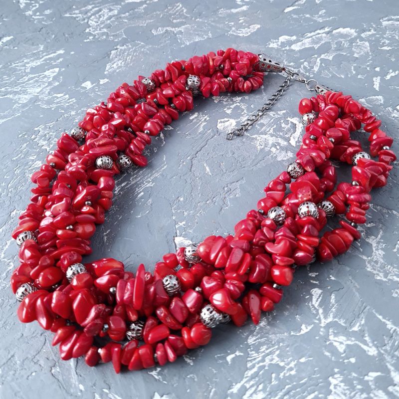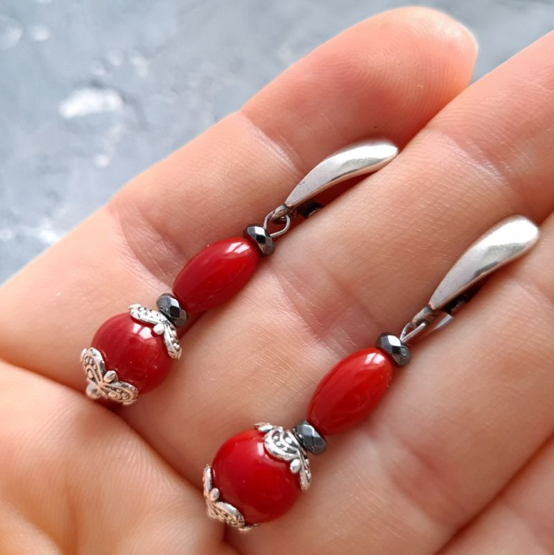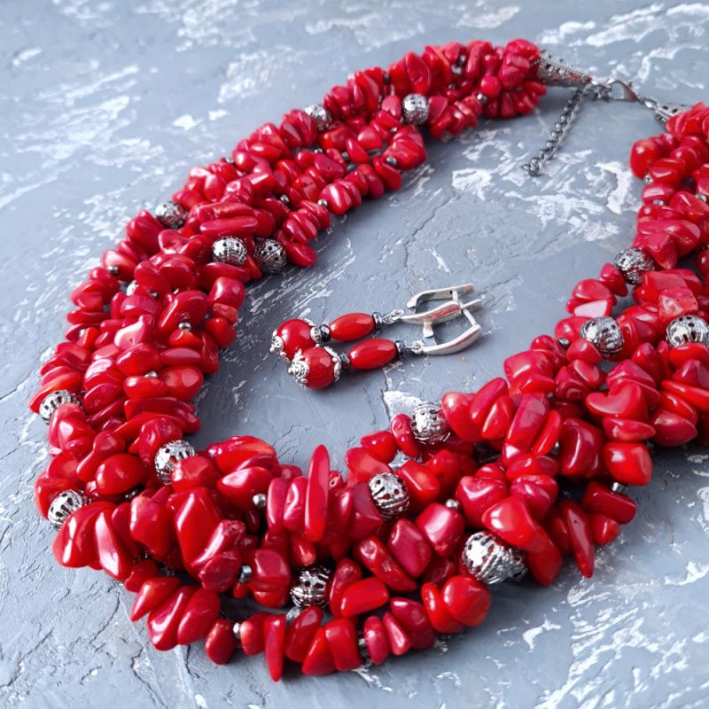 Пишне червоне намисто та сережки з коралів -прекрасний подарунок для вашої подруги, жінки, нареченої, сестри, мами на день народження, на коралове весілля, чи просто, щоб порадувати кохану людину. У намисті також використані намистини гематиту і металічні ажурні намистинки. Вартість вказана за комплект, де довжина намиста 44 см + 5 см подовжуючий ланцюжок і сережки зі срібними застібками 925 проба, англійський замок.