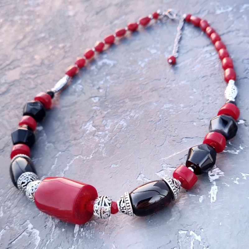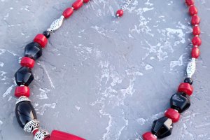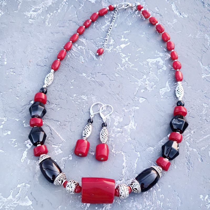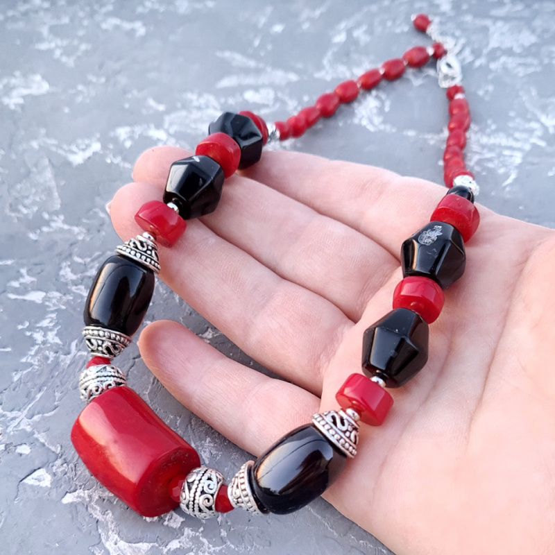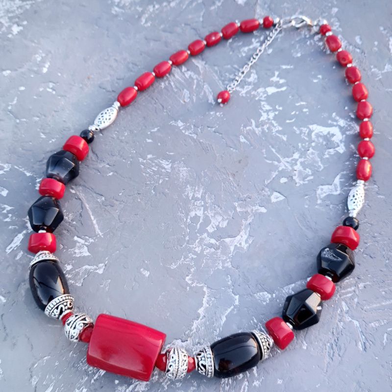 Хочете подарувати своїй коханій, дружині, подрузі чи мамі кольє з натуральних коралів, що буде вражати своєю ексклюзивністю та красою? Тоді найкращим варіантом для вас буде саме таке кольє з величезним натуральним коралом по центру, та чорними агатами різних форм та розмірів. Довжина кольє може бути будь-якою, за вашим побажанням. Довжина кольє узгоджується з замовником після оформлення покупки. Вартість вказана за кольє, як на фото, довжиною 48 см плюс 5 см подовжуючий ланцюжок, що дає можливість самостійно регулювати довжину. До кольє у комплект ви також можете замовити сережки чи браслет з аналогічними коралами. Крім того, ви можете замовити аналогічне намисто на менше, чи більше рядків ( 2, 3, 4, 5). На останньому фото є подарунковий футляр з натурального дерева, що не входить у вартість, але може бути замовлений окремо.